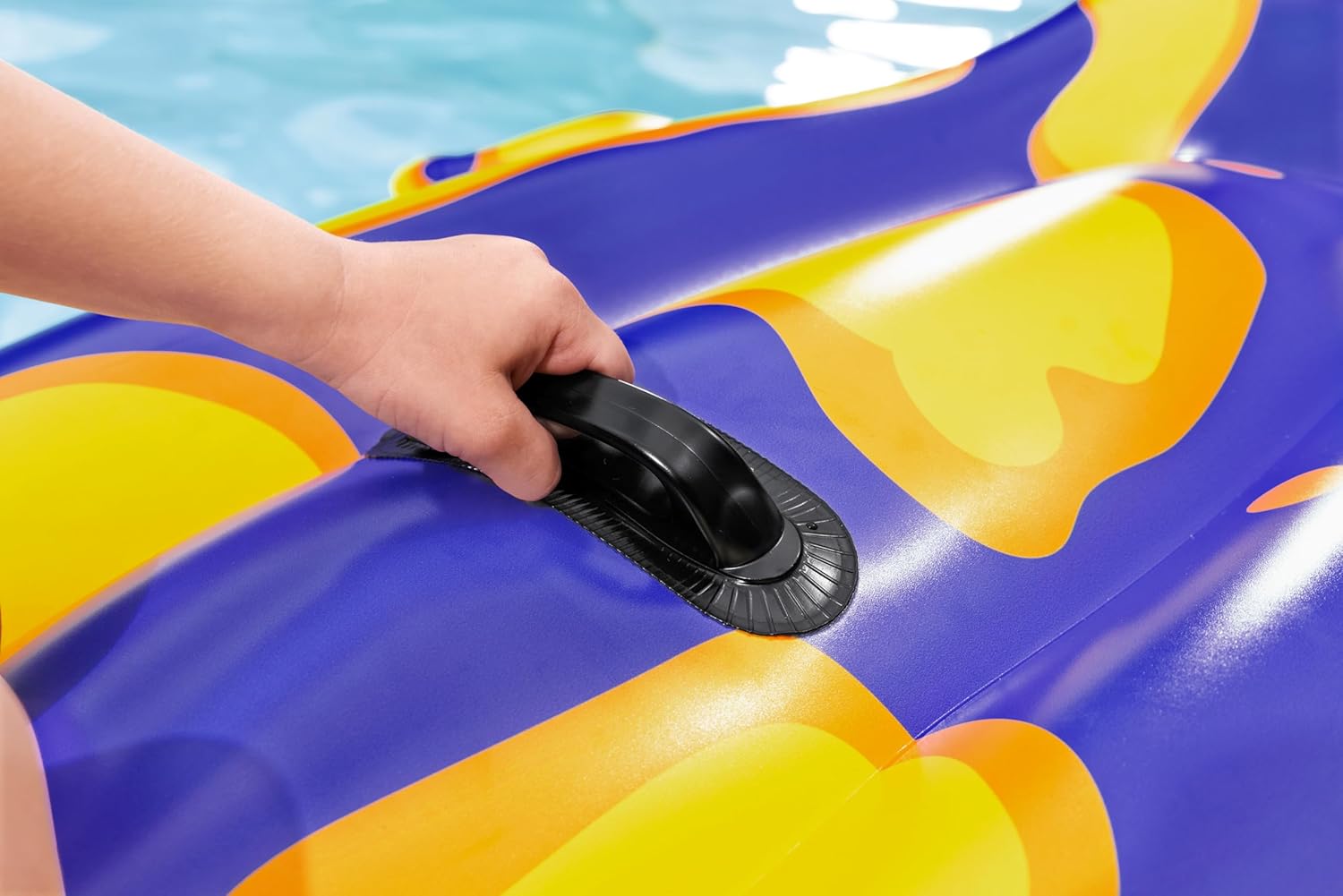 Let your kids grab a friend so they can hop aboard the Bestway® Splashin' Salamander™ Ride-On and have a blast together! Perfect for two kids, ages 3 and up, the Splashin' Salamander Ride-On is the purple-and-yellow amphibian friend who's ready for every imaginative water adventure. With its heavy-duty handles, kids can climb on or off, hold on for a wavy ride and carry the float to its next destination. Easy to inflate, deflate and store, this friendly salamander ride-on will be the float your kids enjoy for many seasons to come. Welcome summer with a splash with the H2OGO! Splashin' Salamander Ride-On!