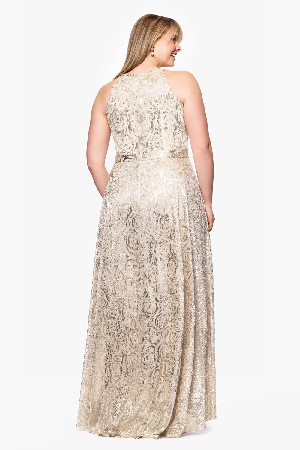 This halter gown stuns with its textured metallic fabric, high neckline, and flattering cinched waist. The full A-line skirt adds movement and elegance, making it an ideal choice for formal evenings or special celebrations. Classic glamour with a modern twist.