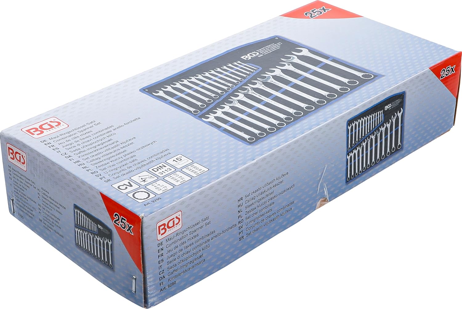 Original BGS: 9290 combination spanner set, 6-32 mm, high-gloss chrome-plated, 25 pieces. The BGS technic brand has stood for excellent quality since the first production in Germany in 1970 and over 60 countries worldwide as well as a variety of innovative novelties and enjoys an excellent reputation among customers. In our range you will find high-quality and durable hand, compressed air and power tools for daily workshop and industrial use. The highest goal in the interests of the customer is to offer all products at the best possible price-performance ratio with fast service. More than 4,000 quality tools and monthly assortment extensions are available in the well-known PRO+ and PRO versions. All products are delivered directly from our modern central logistics with attractive packaging in German and English.