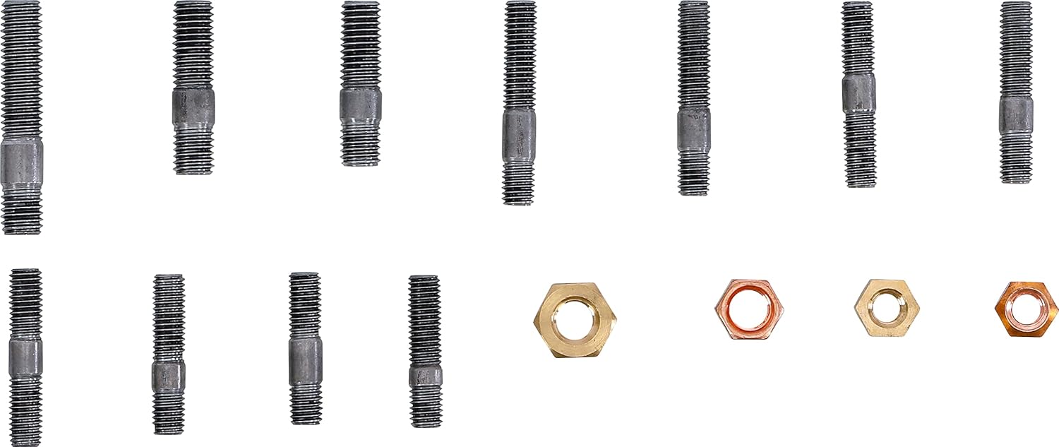 Can be used for repairing and replacing broken or worn studs on the inlet and outlet manifold. Bolts and nuts go through thousands of heat cycles during the life of the engine and often the studs can tear off due to the constant expansion and contraction of the head, manifold and stud bolts as the engine heats up and then cools down Suitable for Alfa Romeo, BMW, Chrysler, Citroën, Fiat, Ford, Mazda, Nissan, Peugeot, Porsche, Honda, Vauxhall, Opel, Saab, Renault, Volvo, VAG. Contains M8 and M10 studs in the most common lengths. Package includes: 5 stud bolts M10 x 1.5 / length: 38 mm / thread length (A): 10 mm / thread length (B): 20 mm. 5 stud bolts M10 x 1.5 / length: 40 mm / thread length (A): 11 mm / thread length (B): 20 mm. 5 stud bolts M10 x 1.5 / length: 54 mm / thread length (A): 11 mm / thread length (B): 32 mm. 5 stud bolts M8 x 1.25 / length: 35 mm / thread length (A): 9 mm / thread length (B): 21 mm. 5 stud bolts M8 x 1.25 / length: 35 mm / thread length (A): 9 mm / thread length (B): 15 mm. 5 stud bolts M8 x 1.25 / length: 37 mm / thread length (A): 10 mm / thread length (B): 20 mm. 5 stud bolts M8 x 1.25 / length: 41 mm / thread length (A): 16 mm / thread length (B): 16 mm. 5 stud bolts M8 x 1.25 / length: 42 mm / thread length (A): 11 mm / thread length (B): 22 mm. 5 stud bolts M8 x 1.25 / length: 43 mm / thread length (A): 17 mm / thread length (B): 17 mm. 5 stud bolts M8 x 1.25 / length: 45 mm / thread length (A): 10 mm / thread length (B): 25 mm. 5 stud bolts M8 x 1.25 / length: 47 mm / thread length (A): 15 mm / thread length (B): 24 mm. 5 stud bolts M8 x 1.25 / length: 47 mm / thread length (A): 10 mm / thread length (B): 25 mm. 10 steel nuts, copper-coated M8 / 13 mm hexagon. 10 steel nuts, copper-coated M10 / 14 mm hexagon. 10 brass nuts M8 / 13 mm hexagon. 10 brass nuts M10 / 17 mm hexagon. Tensile strength stud bolt: 4.8. Stud bolt material: tool steel (Q235). Nut material: brass.