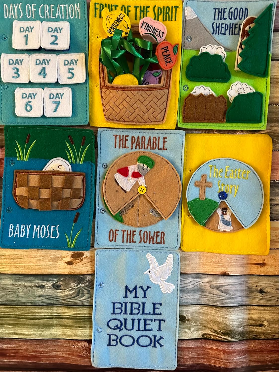 Introduce your child to the world of spirituality with our enchanting 'My Bible Quiet Book'. Its vivid blue hues alongside pops of yellow, green, and white are sure to catch children’s eyes. Literally a mini book of bible stories, this wonder is the perfect gift from godparents to godchild, from parents to children, or even from teachers to students. Rich in the sharing of vital bible stories, this product embodies learning, religion, and joy - all packed in a child-friendly format. Here are some fantastic features you’ll love: - Engrossing stories: Six beautifully embroidered bible stories can keep your child engaged and educated at the same time. - Safe and durable materials: Crafted with acrylic felt and embroidery thread, this book is designed to stand up to little hands. - Easy to handle: Compact size of 5x7 inches makes it perfect for little hands to explore. -Playful colors: The combination of blue, green, yellow, and white makes the book bright and inviting. - Safe for children: It's recommended for children over three, with easy-to-open plastic kam snaps and metal binder rings. Select a gift that imparts wisdom and knowledge, and watch as your child's curiosity comes soaring to life. Watch the eyes of your little one light up as they navigate through the stories of their very first 'My Bible Quiet Book'. Designed for your child's eager little fingers, this bible book initiates them into the divine adventure of learning and devotion. Perfect for occasions such as baptisms, birthdays or Easter, this one-of-a-kind gift straddles the line between fun and faith - making it the purchase that you and your child need.