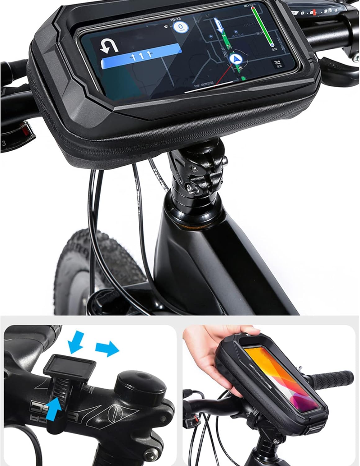 🚴♀️Features:2-in-1 Bike Frame Bag : Bicycle Phone Bag combined both storage bag and phone case, comes with transparent TPU touch screen which provide over 90% sensitivity, ensures maximum ease of use during cycling.Water Resistant Material: Bike phone pouch is made from high quality waterproof PU & EVA materials, so you don't need to worry about the wet environment or sudden stormy, feel free to enjoy your riding!Quickly Installation & Safety: Designed with three straps, this pouch bag can be securely attached to the frame of your bike, tear-resistant straps holds the bag as well as your belongings firmly, never fall off.🚴♀️Description:Material: PU+EVA Hard ShellSize: About240*110*130MMWeight: About 195gCapacity :0.6LColor: Black🚴♀️Package Included:1*Bicycle Bag🚴♀️Note:Due to manual measurement, there might be slight differece. Please kindly understand.
