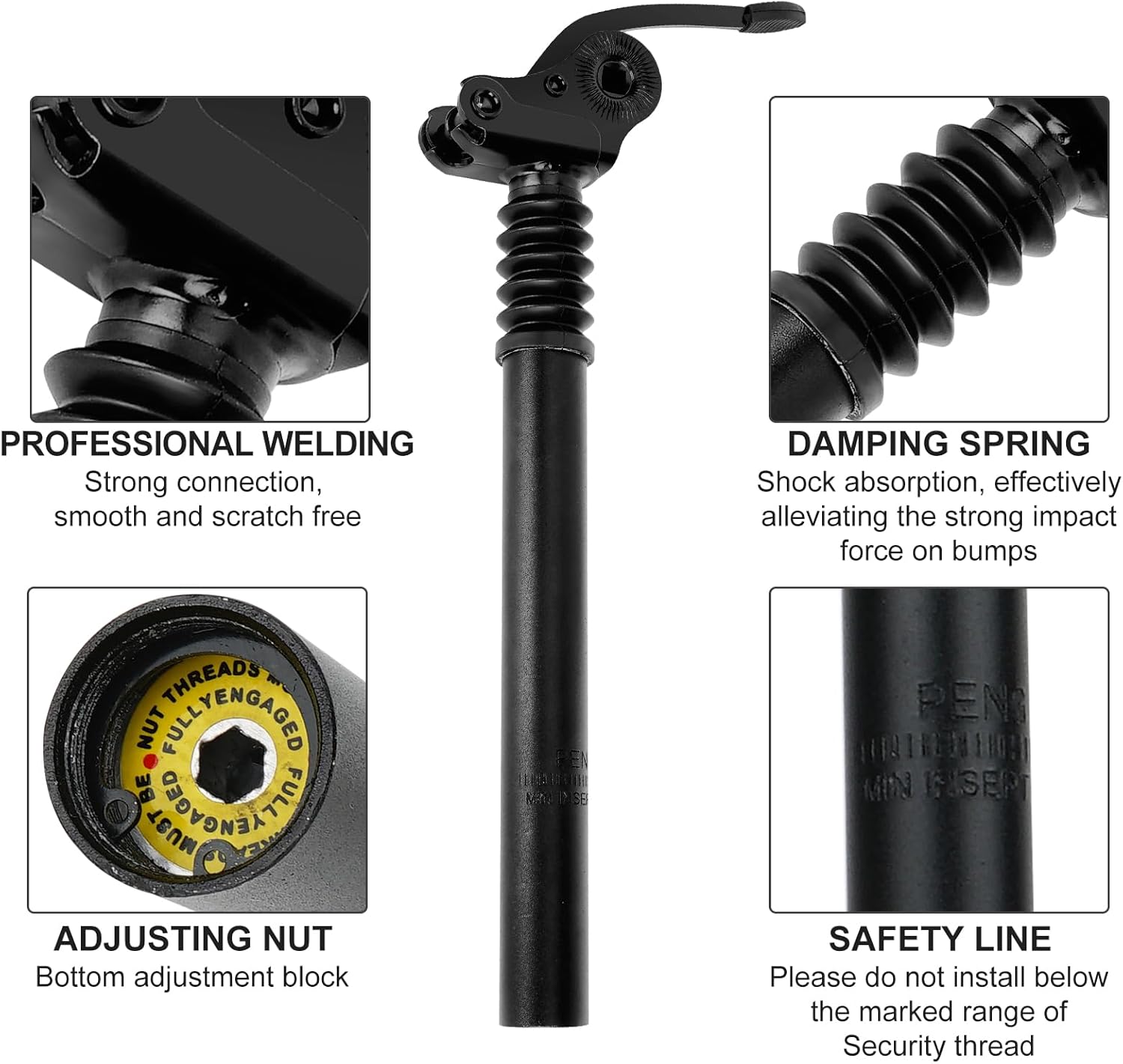 Name: Bicycle seat postMaterial: Aluminum alloyColor: Frosted blackNet Weight: 520 gramsDiameter: 1.07 inchesLength: 11.81/15.75 inchesFeatures: Flip, built-in spring shock-absorption[Packing List]1*Bicycle seat tubeThe product only includes the seat post (as shown in the picture), and other parts are not included.【 Good shock-absorption performance 】: The Bicycle Seat Post built-in spring coil and rubber absorb vibration during cycling, soothing your riding experience and improving impact. Farewell to the pain in the buttocks while driving, the bicycle suspension seat may be affected by many impacts and vibrations. The maximum load-bearing is 100 kilograms.【 Wide range of uses 】: The Bicycle Seat Post 1.07 x 11.81 inches standard size makes this suspension post suitable for most Racing bicycle, fixed gear bikes, mountain bikes, downhill bikes, cross-country bikes, BMX, DH and electric bikes.【 Adjustable Suspension 】 The bicycle spring seat column has adjustable and ultra sensitive stroke. Adjust the preload and replace the springs to find the perfect setting, and adjust the seat pillar to your preferred cycling style. If you use an electric bicycle, it can also easily remove the battery from the seat.【 Adjustable clamping angle 】: Bicycle Seat Pole with a stable saddle platform, steering provides greater control and gentle driving. The bicycle shock absorber mount is a perfect upgrade for electric bicycles and folding bicycles. A more comfortable ride means that even on rugged terrain, you can ride longer, walk faster, and maintain control.【 Easy to install, maintenance free 】: The Bicycle Seat Pole easy to install, can be completed in a few minutes. If you have any questions, please feel free to contact us and we will contact you within 24 hours.Note: When lifting the seat, you need to press the button, and when putting down the seat, you also need to press the button and press it down at the same time. This process is not laborious. Please do not press the seat directly, it is impossible to restore the seat directly without pressing the button.