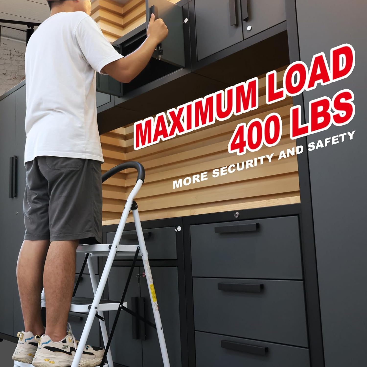 This step stool features a high-strength steel frame for sturdiness and reliability. It supports up to 400 pounds, fitting daily home/office needs, and is a safety-focused folding option. 3 step ladder with a soft non-slip sponge handle, it boosts safety when ascending. Lightweight and foldable, it’s easy to carry for home and office use. Step ladder folds quickly into a compact size. Stores in bathrooms, sheds, etc., saving home/office space. 3 step ladder folding step stool textured non-slip treads secure feet. Thickened rubber feet reduce sliding, ensuring safety.3 step ladder folding step stool adopts triangulation mechanics with one-piece steel tubes. Eliminates wobbling, providing reliable support.