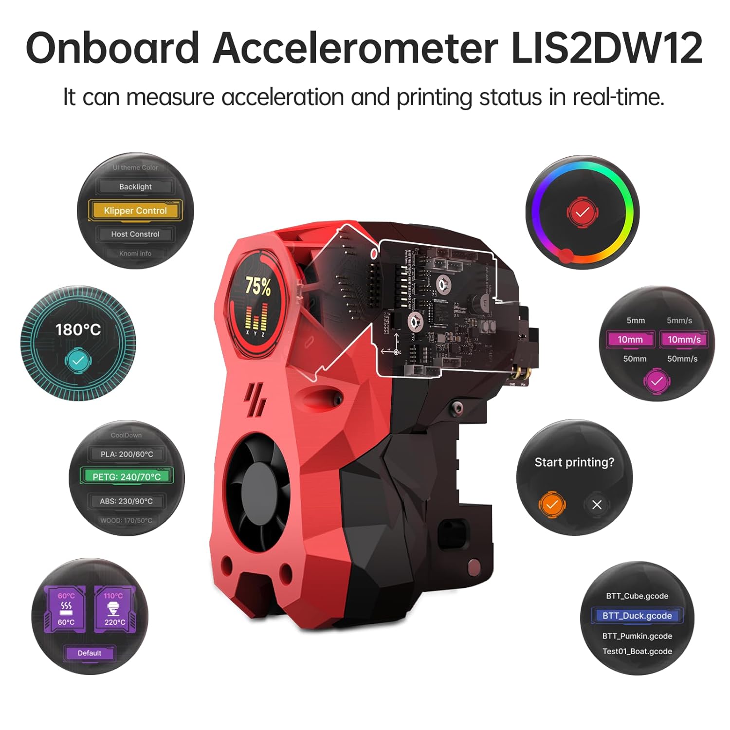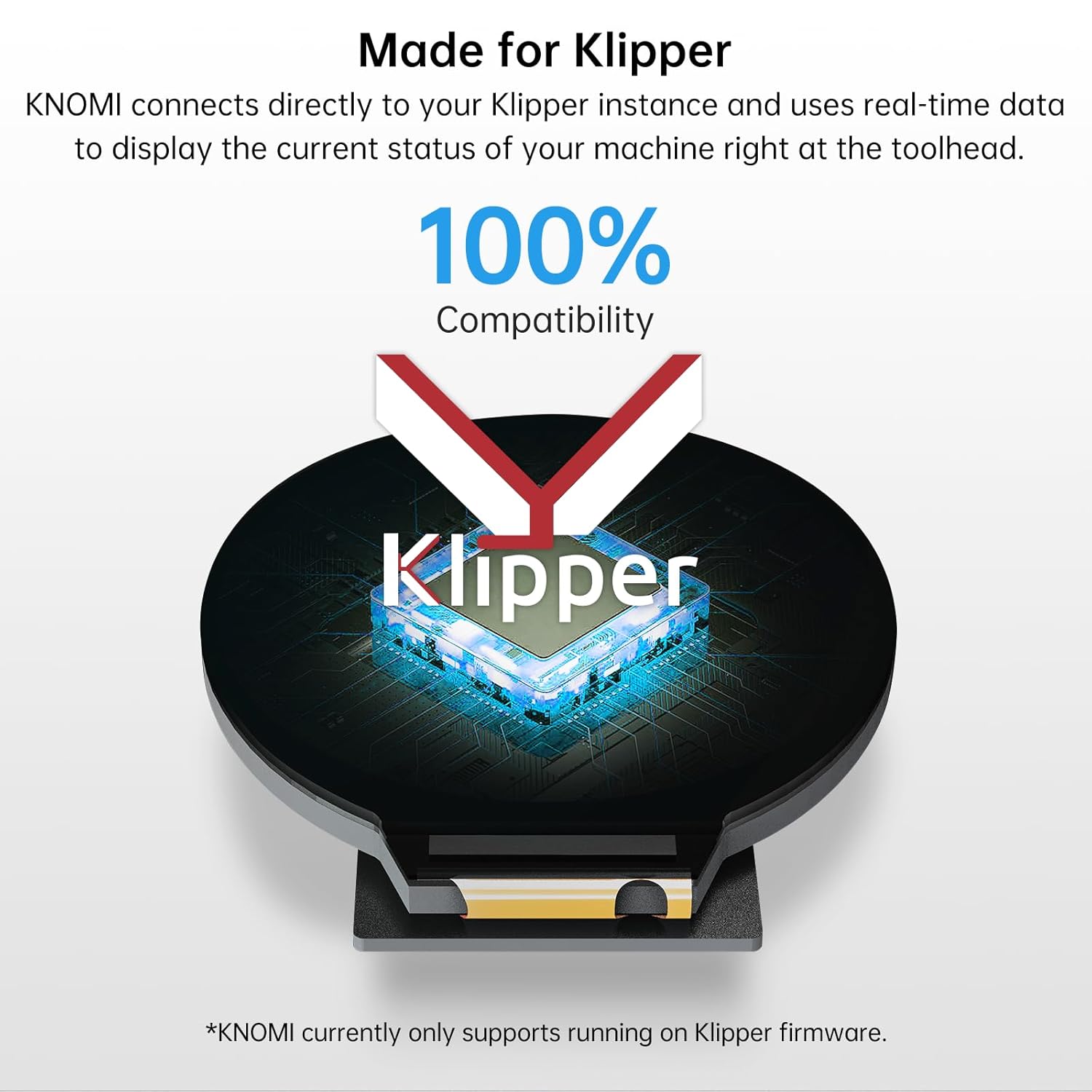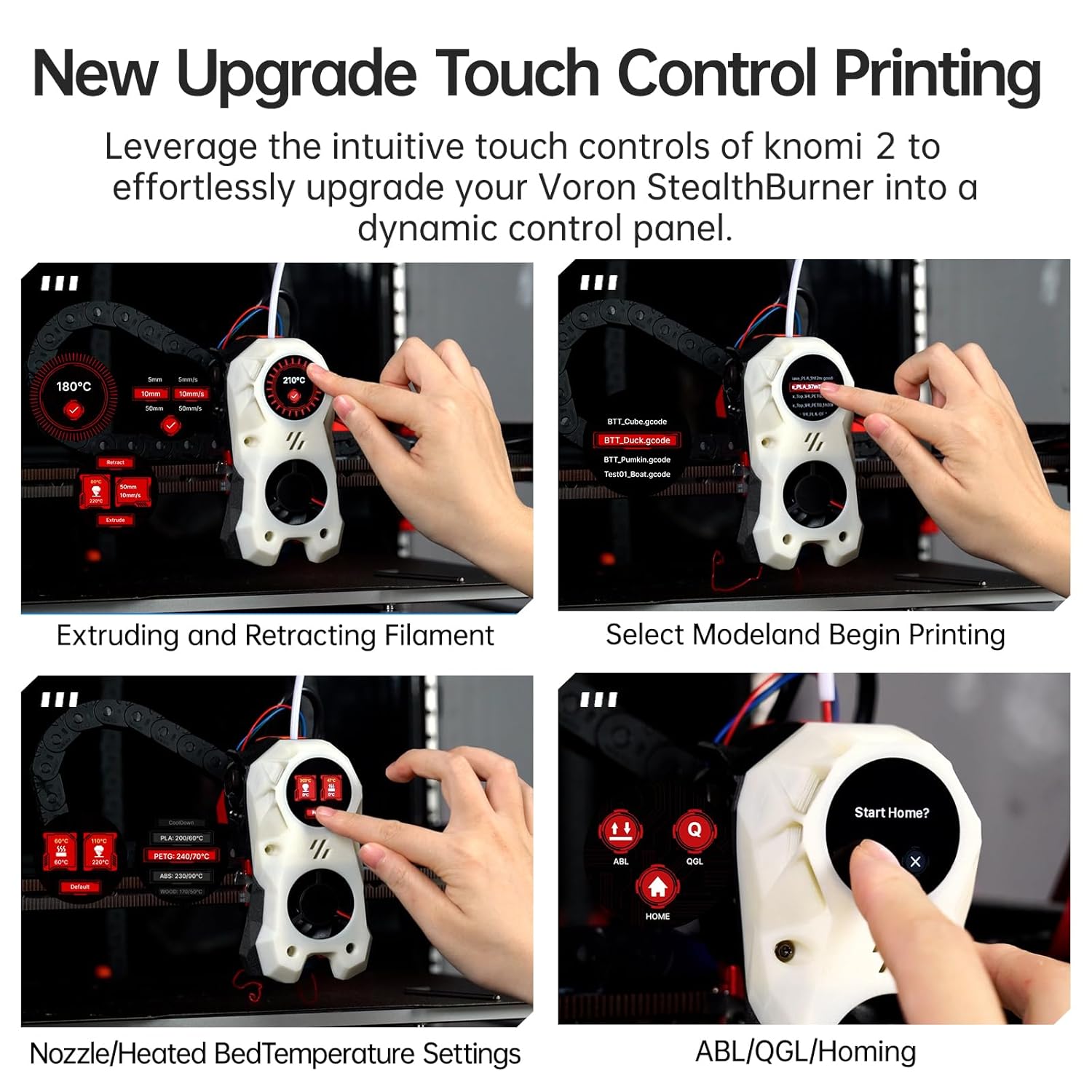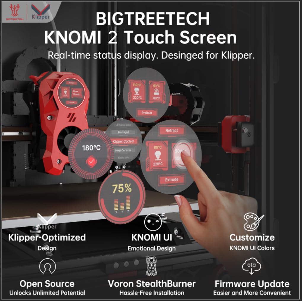 The BIGTREETECH Knomi V2.0 screen is a screen developed by the 3D printing team of Shenzhen Biqu Technology Co., Ltd. for Voron StealthBurner printer nozzle display. Support for touch, making it convenient for customers to perform machine control operations. Display size:1.28inchesOverall Dimensions:35*38mmDisplay Area:32.4(H)mm x 32.4(V)mmResolution: 240 RGB x 240 dotsViewing Angle:178°Backlight Brightness: 400Cd/mBacklight Lifespan: >20000 hoursChip:GC9A01Enhanced Interactivity and Expandability:1.Support Open Scource2.Support Touch Function3. Support Multi-Color UI4. Support OTA/External Wifi Antenna5. Expansion interface:OV2640 camera inerface(GPI0),I2C.6. Onboard accelerometer:LIS2DWI2Power Supply:Input: DC 5V 1ALogic Voltage:DC 3.3VRated Power: 5W Communication & MermoryCommunication: ESP32-WIFI 802.11b/g/n (802.11n,up to 150 Mbps),operating center frequency range: 2412-2484 MHz.Wireless Connectivity: Onboard 2.4GHz Wi-Fi+Bluetooth Low Energy (BLE)SoC IEEE 802.11b/g/n(2.4GHz Wifi )and Bluetooth 5(LE)Falsh: 16MBRSRAM: 8MBOperating & Storage:Firmware Support:KlipperOperating Temperature:-20°C to 70°CStorage Temperature: 30°C to 80°C