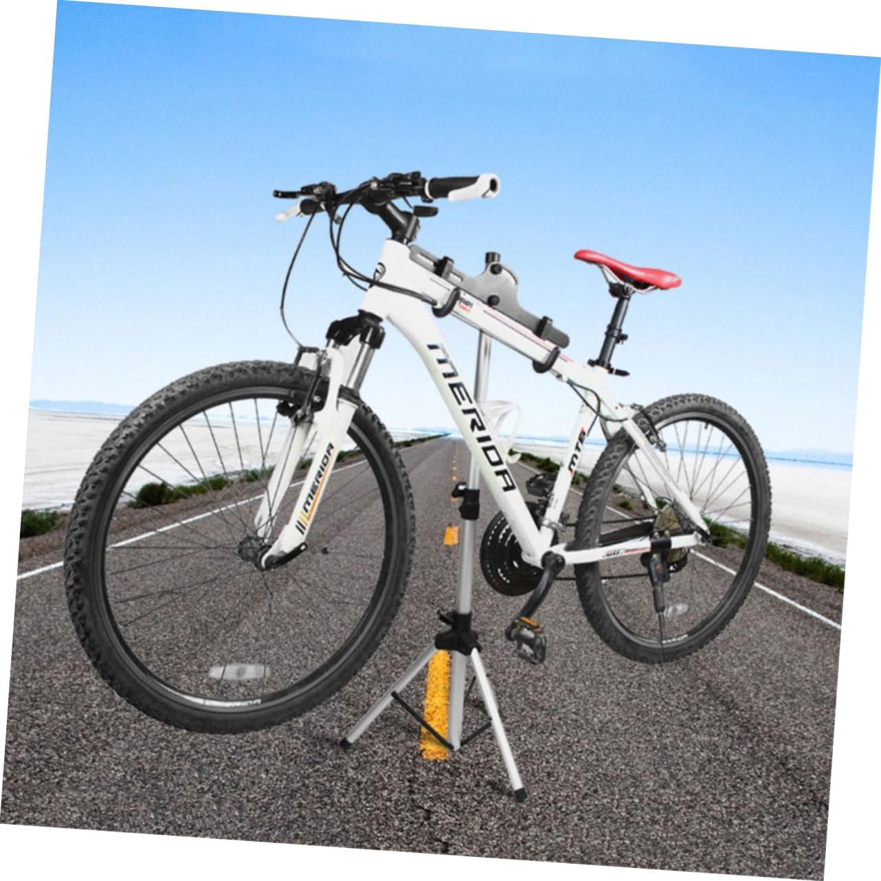 Package Include 1 x Adjustable Repair Mechanic Bike Stand Characteristics - Size: About from 70 cm to 132 cm in length stand. - Material: Aluminum Alloy. - Maximum capacity of 110lbs/50kg due to heavy duty construction. Pre-drilled holes in feet for anchoring to surfaces repair stand. - Particularly suitable for car shops, clubs, dealers and enthusiasts . - Convenience, Super easy setup and assembly bike stand. - Adjustable handlebar rod stabalizes the front wheel, legs fold up for easy storage or transport bike repair stand. - Clamps hold tight but won't damage your bike's finish, 360 degrees for easy access to every part of your bike. - ColorSilverGoods Informationstand The adjustable handlebar rod stabilizes the front wheel for easier repairs.repair stand Are you still annoyed by the inconvenience of repairing your bike? The professional repair stand is so versatile, you can mount your bike in almost any position and lock it in place with a simple of a knob or two