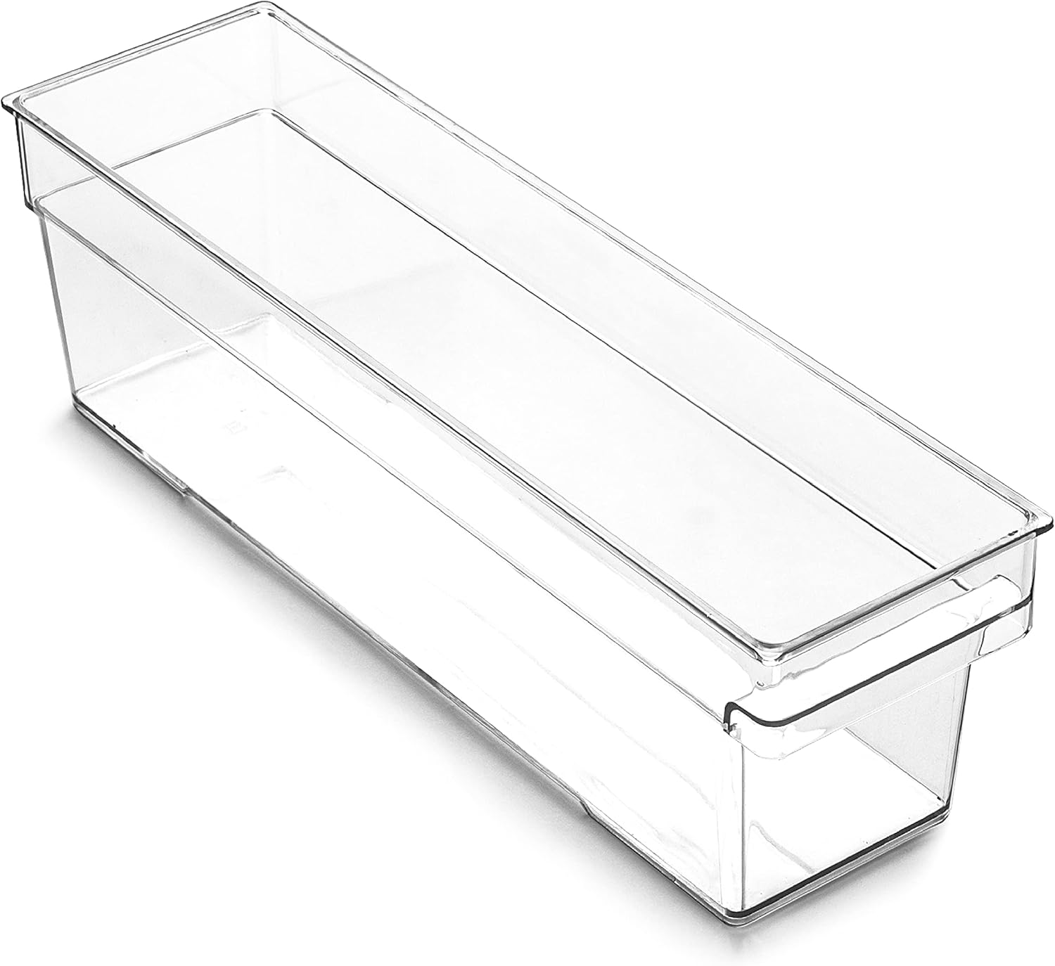 MULTI-FUNCTIONAL STORAGE — Keep pantry shelves neatly organized, re-organize your fridge, or use in the home, office, or garage for custom organization. Also, great for craft supplies, utilities, or in the laundry room PLASTIC STORAGE BINS — BINO’s easy access pull-out plastic bins fit most refrigerator’s and freezer’s, and are great to use in your pantry closets. Turn any shelf into a drawer, saves the time and hassle of looking through the refrigerator for your favorite foods. STORE MORE IN LESS SPACE — Versatile container extends to the back of your shelf, so you don’t have to. These bins can also be nested, so if not in use, these storage bins won't take up much space. CLEAR & DURABLE — Transparent pantry container bin for easy viewing – quickly locate the contents. Made from premium grade BPA free plastic NOT TOO BIG, NOT TOO SMALL — Available in 9 different sizes. This ‘Shallow, Small’ bin Measures approximately 12"L x 4"W x 4"H.