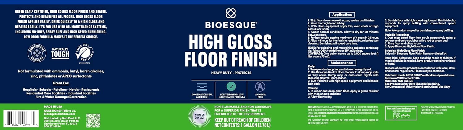 Bioesque High Gloss Floor Finish is a Green Seal certified, high solids floor finish and sealer. It protects and beautifies all floors, including vinyl tile, terrazzo and stone substrates. High Gloss Floor Finish applies easily, dries quickly to a high gloss and repairs easily. It is for use with all maintenance systems, including no-buff, spray buff and highspeed burnishing.