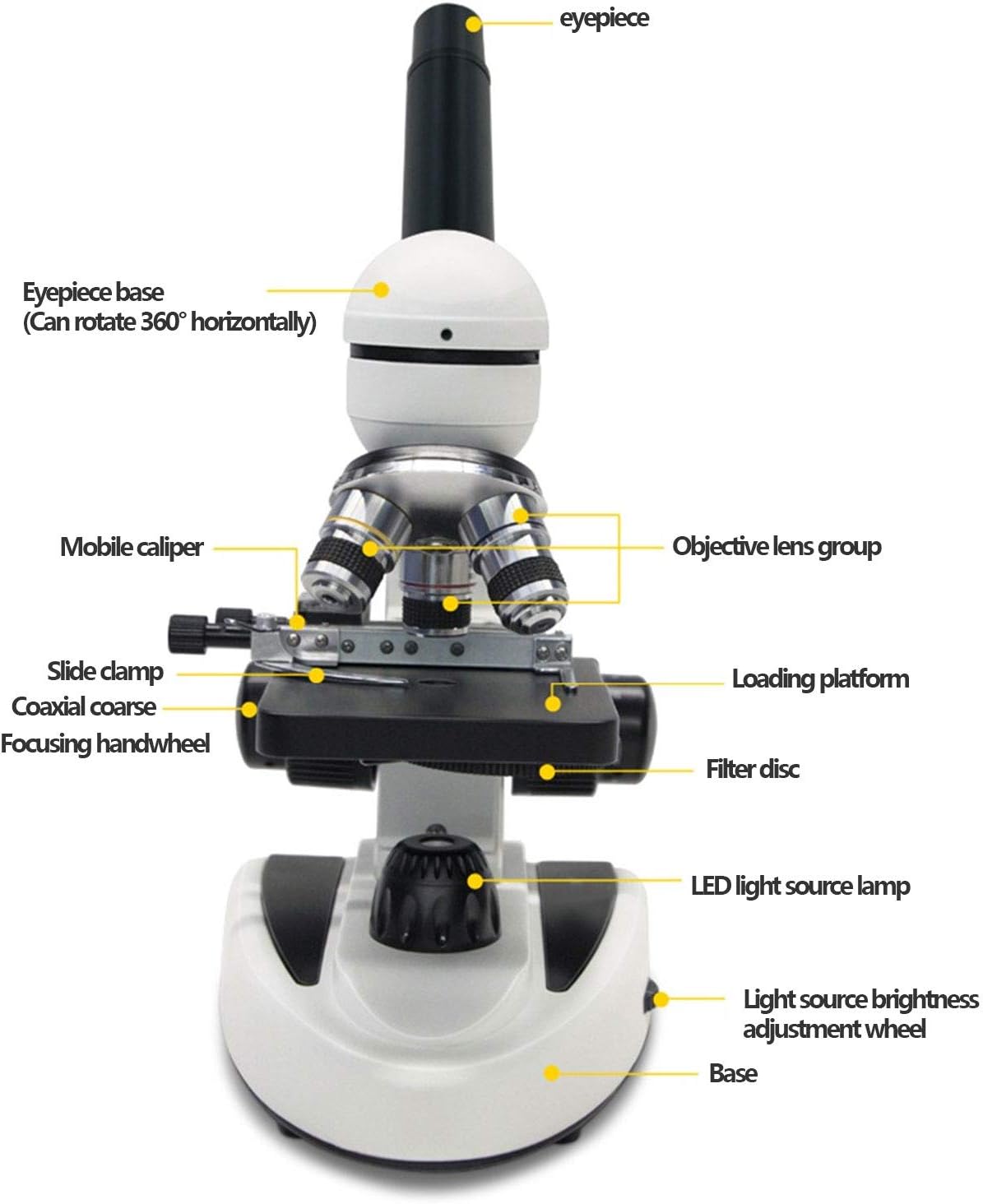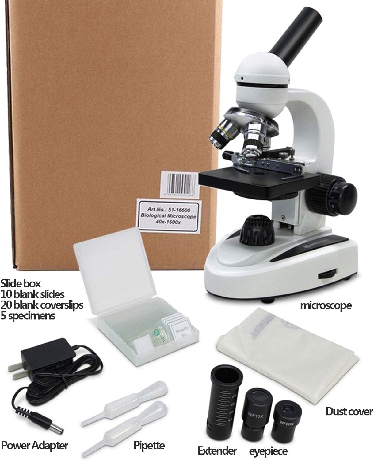 product description specification Name: Microscope Magnification: continuous zoom Structure: Monocular Main mirror structure: catadioptric Can an external monitor: Can an external monitor Illumination system: LED transmission, stepless adjustment Eyepiece: WF10x, WF20x achromatic eyepiece Objective lens combination: 4x, 10x, 40x Observation method: monocular Focusing system: Coaxial coarse and fine adjustment Magnification: 40x-1600x Drive mode: 220V AC power supply/3 AA batteries Purpose: Natural observation, scientific research and teaching Applicable people: Adult/advanced first choice feature 4 times, 10 times, 40 times achromatic objective lens-45° tilted monocular head-metal loading platform-mobile caliper-coaxial coarse and fine focusing system-LED lighting-AC power / AA battery drive service If you have any questions about our children's microscope, we will reply you within 24 hours. Thank you. Your satisfaction is our service standard Package includes Slide box (10 blank slides) (20 blank coverslips) 5 specimens-microscope-dust cover- Power adapter-pipette-extender-eyepiece