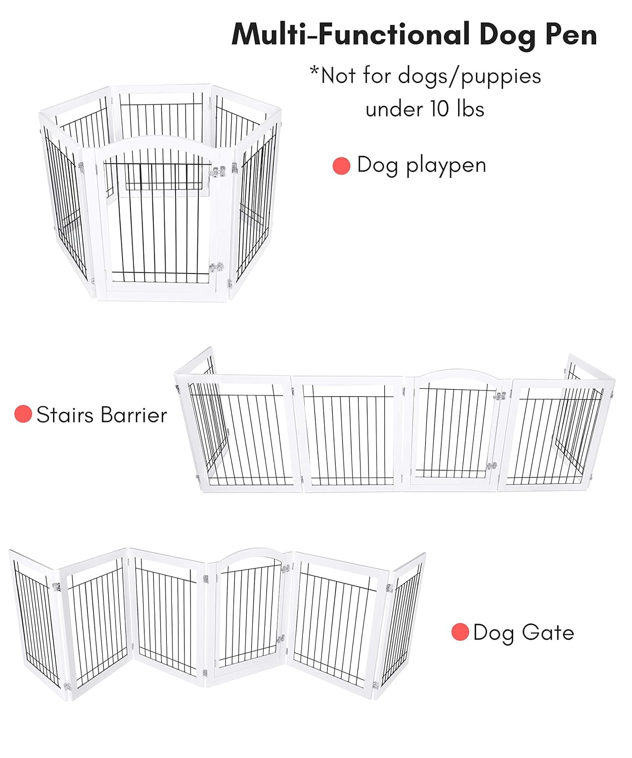 The BIRDROCK HOME Indoor Dog Gate with Door is a versatile, durable, and convenient pet accessory. Featuring a 6-panel design, it can be configured into various shapes, including a playpen or room divider. Made from robust MDF and steel wire, it ensures long-lasting use. The built-in door allows easy access, while the gate folds for easy storage. Ideal for small dogs and puppies, it provides a secure environment and adds a decorative touch to your home. Its durability and flexibility make it an ideal choice for pet owners.