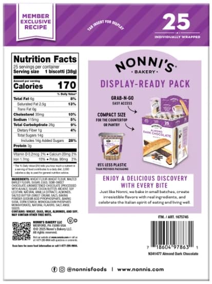 Almond biscotti dipped in gourmet chocolate Perfect with a mocha, latte or even a glass of milk Individually wrapped 24 delicious Biscotti dipped in rich dark chocolate and baked with real Califonia almonds and rich creamy butter Premium rich dark chocolate made with 55% cocoa Oven roasted California almonds for that savory nut crunch No artificial flavors, colors, or preservatives