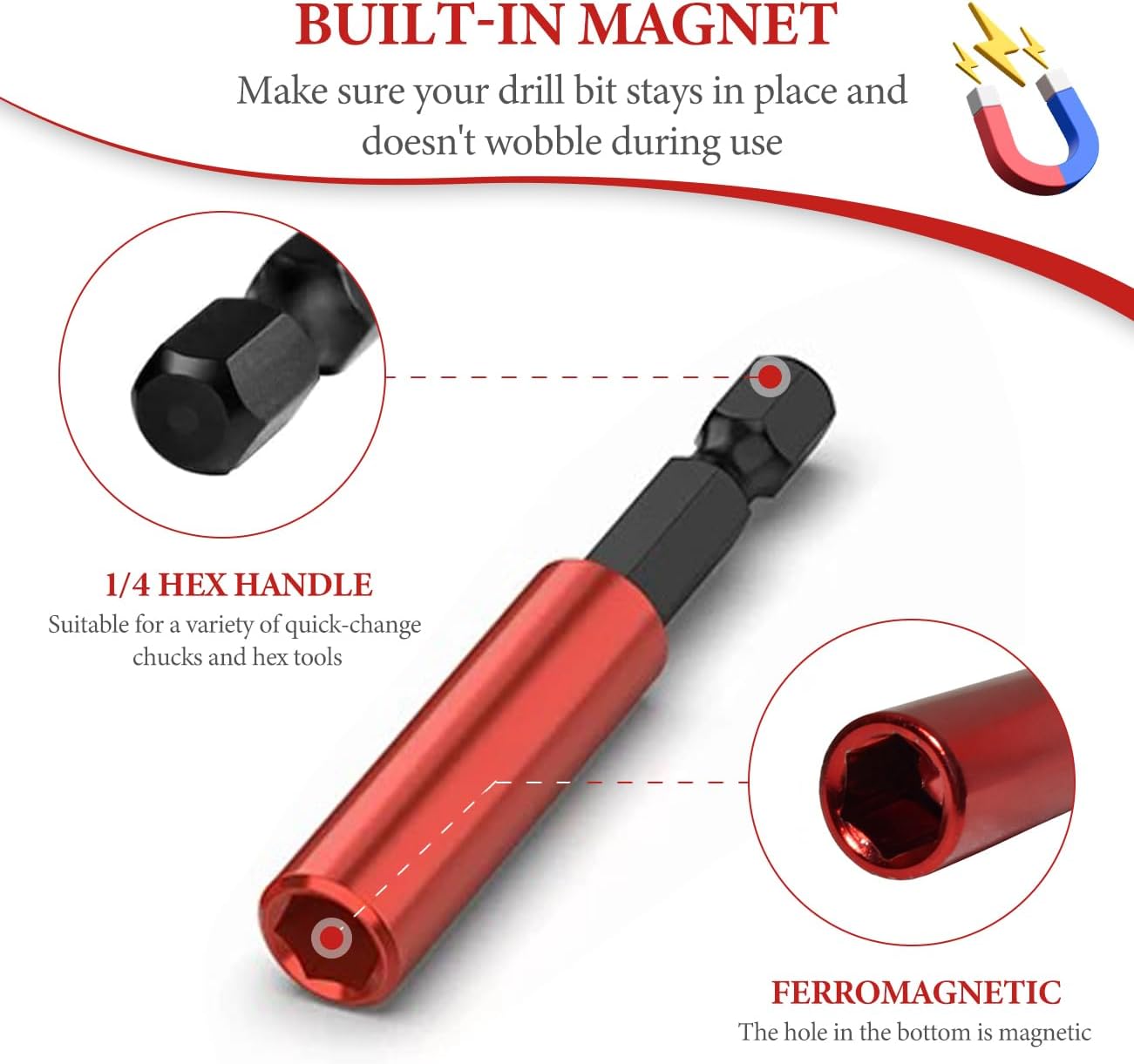Hiacinto 5-Piece Bit Holder Set - Professional Magnetic Bit Extensions in 5 Lengths for Maximum Range & Hold Reach any screw head effortlessly! The Hiacinto bit holder set is your ultimate solution for assembly, repair and maintenance work in tight or hard-to-reach spaces. This professional 5-piece set combines high-quality bit extensions with practical magnetic bit holders in five different lengths. Whether you are a DIY enthusiast, car mechanic or industrial tradesman - with the robust chrome vanadium steel extensions and the extra strong magnetic force, you are prepared for any challenge and work more efficiently than ever before. Your 3 advantages with the Hiacinto bit holder set: Five sizes for maximum flexibility and range: our set contains bit extensions in lengths 50 mm, 60 mm, 100 mm, 150 mm and 300 mm. This selection offers you the perfect solution for any situation - from short extensions for precise work to long bit holders for deep or distant screws. Strong magnet for safe and efficient working: each extension is equipped with a powerful ring magnet. This magnetic bit holder reliably holds your bits and even screw heads, prevents annoying falling out and still allows for quick bit changes. So you save time and nerves. Robust quality for professional and durable use: made of wear-resistant chrome vanadium steel (Cr-V), these bit holders also withstand high torque and intensive use with cordless or impact drivers. They are durable, not easy to break and are your reliable companions for demanding projects. Product specifications: Box contents: 5-piece set with bit extensions/bit holders. Lengths: 50 mm, 60 mm, 100 mm, 150 mm, 300 mm. Material: high-quality chrome vanadium steel (Cr-V) with magnetic pick-up head. Compatibility: 1/4 inch hex shank (6.3 mm). Universally compatible with standard screwdrivers, cordless screwdrivers, impact drivers, drills and most bits.