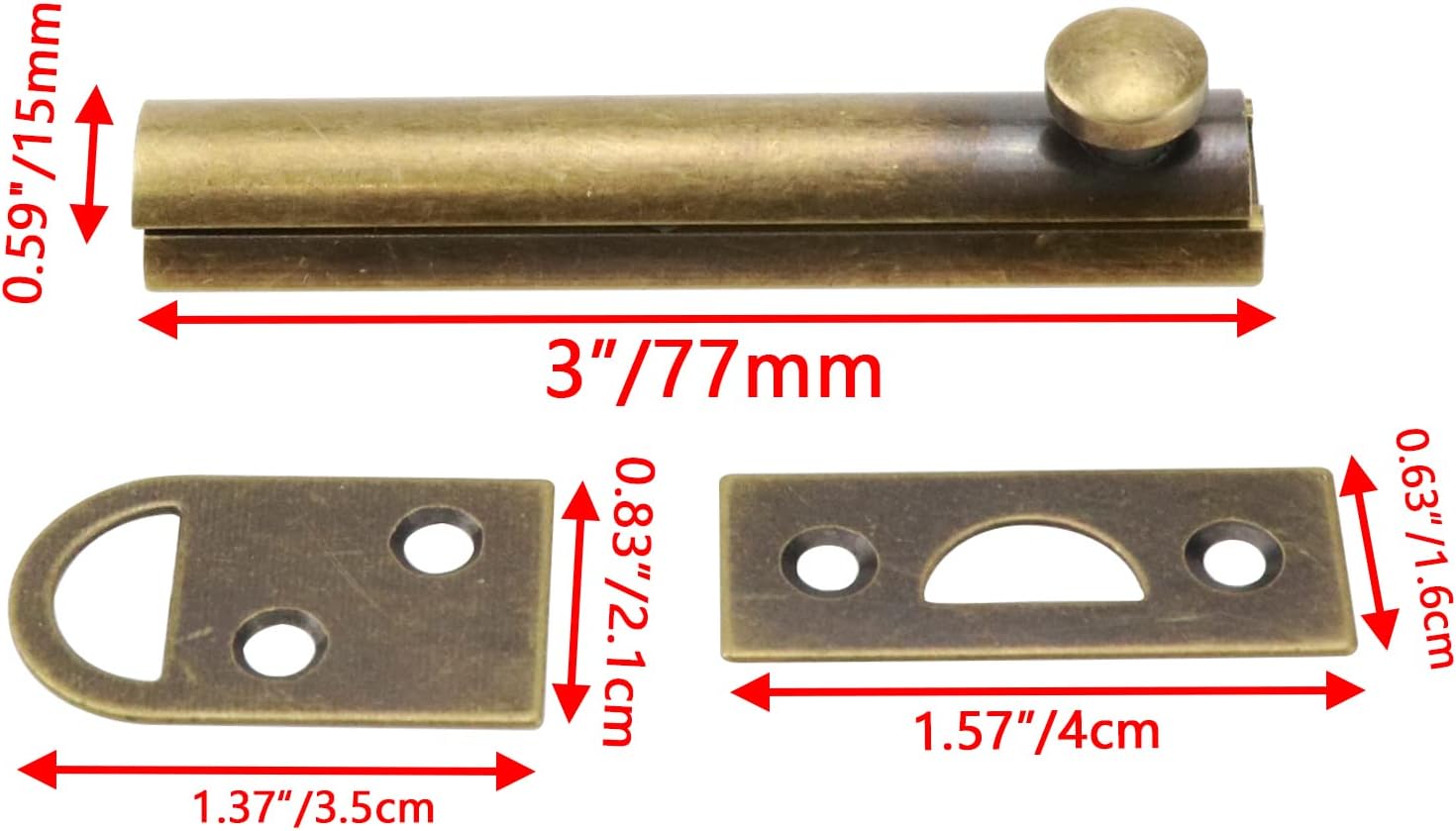 Dimension Total Size: 3"/77mm x 0.63"/16mm(L x W) Square Strike Part Size:1.57"/40mm x 0.63"/16mm(L x W) Haft Circle Part Size:1.38"/ 35mm x 0.83"/21mm(L x W) Screw Hole Dia:0.16"/4mm Package Content 1pcs x Slide Latch + Screws Product Feature 1.Convenience sliding design,bolt locks are provide added security to make your living environment more comfortable. 2.Exquisite concise appearance,sealed welding,thick and reinforced base,not easy to break and deformation,solid and durable. 3.Solid brass sliding bolt has beautiful color and design. Please note that brass products will be oxidized by air or sweat. We will be here for you all the time.