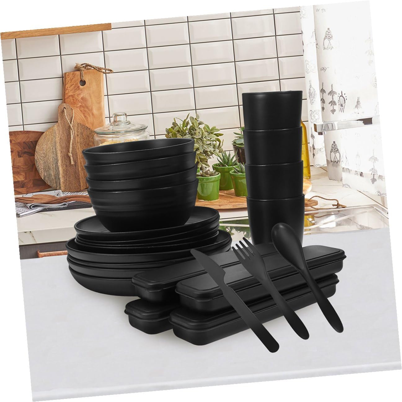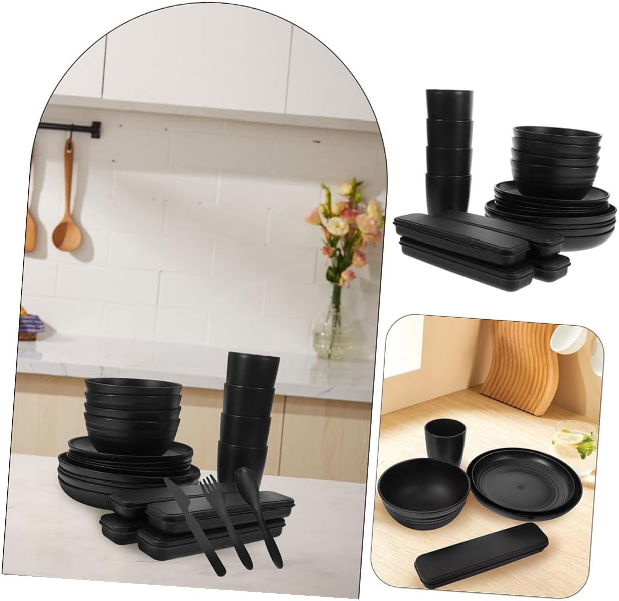 Package Include 4 x bowls 4 x plates large 4 x plates small 4 x cups 4 x sets of cutlery (boxed) Characteristics -Size:20.50X5.50X2.50cm/8.06X2.16X0.98in (box) -Size:10.80X8.00X5.00cm/4.24X3.14X1.97in (cup) -Material:reusable PP -Size:20.00X20.00X3.00cm/7.86X7.86X1.18in (plate) -Product Info:Black tableware set -Size:14.50X14.50X7.50cm/5.70X5.70X2.95in (bowl) -Color:Black - Suitable and wonderful for picnic, hiking, camping, climbing, BBQ and other activities camping silverware. - Smooth surface without burrs, easy to use and clean, will not scald or hurt your hands camping cutlery. - The Cutlery is able to satisfy your needs no matter at home or outdoor, useful and simple to use dessert bowls. - This reusable and versatile bowl is the perfect solution for your different food storage needs outdoor cutlery. - Practical bowl can be used for storage porridge, noodles and soup, fit your different demands perfectly picnic tableware.Goods Informationcamping silverware Made of sturdy material, smooth surface, can keep this ramen bowl for longtime using.reusable cutlery This bowl is good for storing food such as noodles, porridge, soup, salad and so on.camping cooking utensils If you are in search of a bowl with multiple uses, then you can take at our bowl