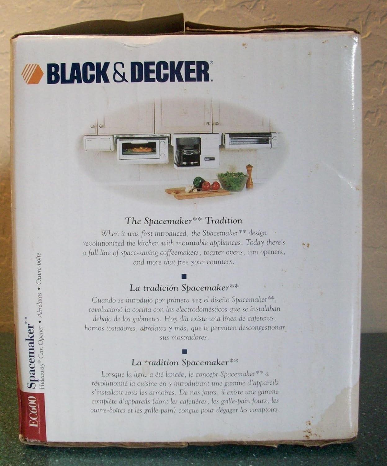 Product Description Save kitchen counter space with this wall mounted electronic can opener Dishwasher safe Color - White free operation auto shut off blade release for cleaning dishwasher safe Amazon.com Convenient when in use, inconveniently taking up counter space when it's not, an electric can opener can be more trouble than it's worth. Black & Decker solves the problem with this compact model. It mounts underneath a cabinet, where space is wasted anyway, and, as if that weren't enough, the opener's face pulls down when it's needed and then snaps back up to conserve even more space--and to look neat and tidy. A magnet extends automatically to secure lids. For cleanup, the blade assembly pops off at the push of a button and can be put in the dishwasher. Made of gleaming white plastic, this can opener is barely noticeable and looks good when it is noticed. --Fred Brack