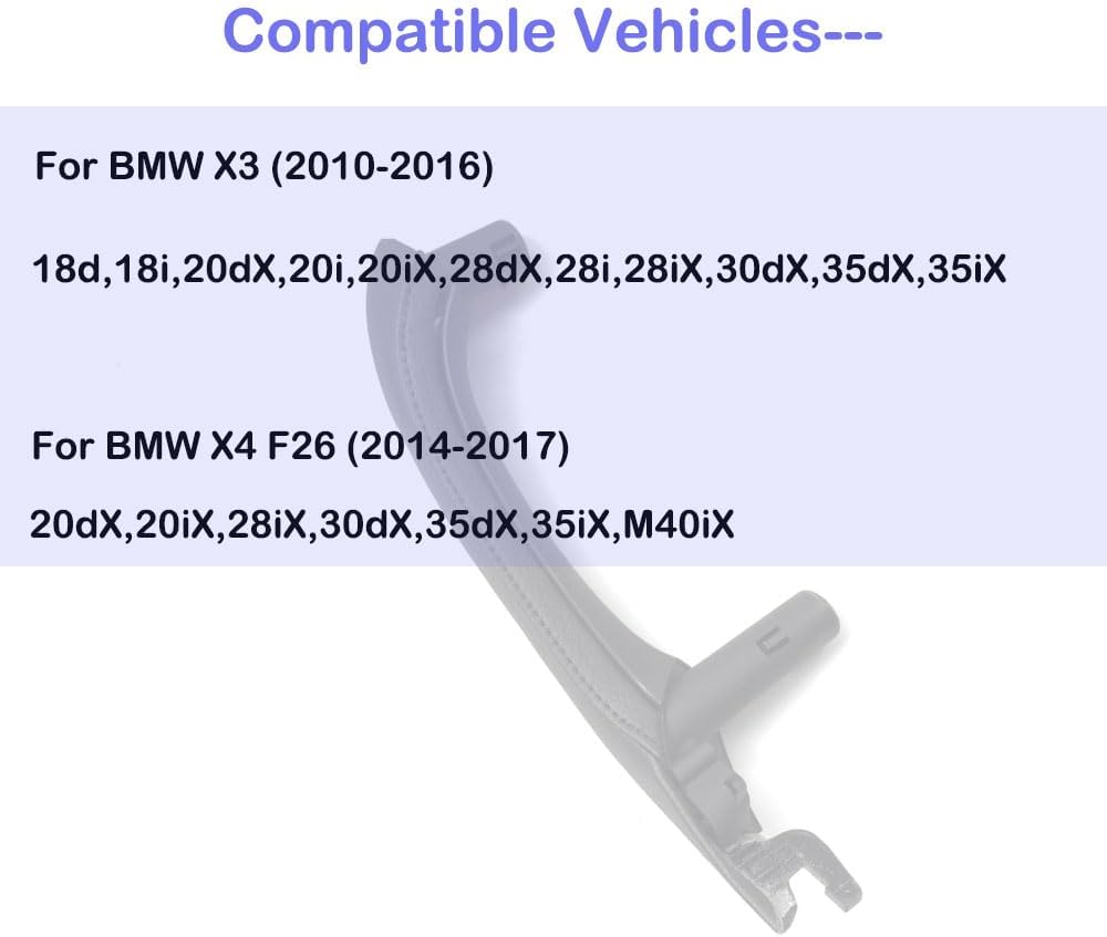 [Application]: Right Black Interior Door Handle with Leather Cover Assembly for BMW X3 X4 F25 F26 2010-2016[Reference OE NO].: 51419209216 (Inside handle panel),51417248502 (handle outer leather cover)[Material]: PC and ABS, Rubberized Coating, Ultra-fine fiber Leather[Advantage]: Upgraded material for the inside handle panel, it will be no-sticky hand, not easy to be aging, the outer leather cover is Ultra-fine fiber Leather which is more eco-friendly, scratch-proof, more durable than original parts, also can replace the original handle perfectly.[Package]: Including one piece of the door handle and one piece of the door handle leather cover.Remarks: Do not combine the door handle and handle cover into the assembly before you install it. when you install the handle, you can replace the inside door handle panel first, then install the handle leather cover finally.