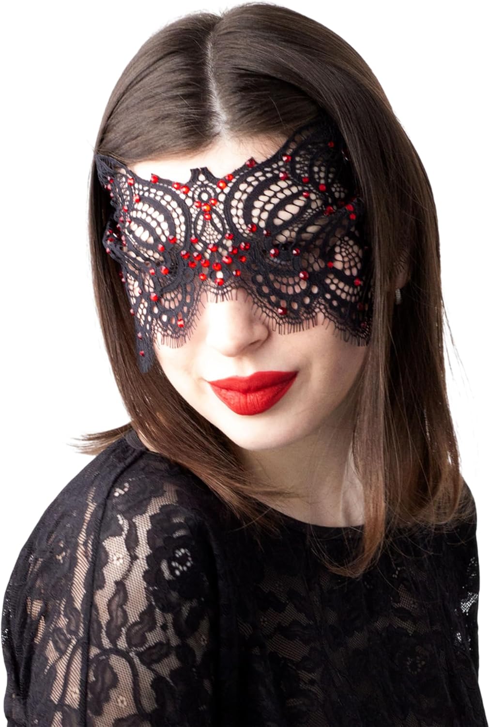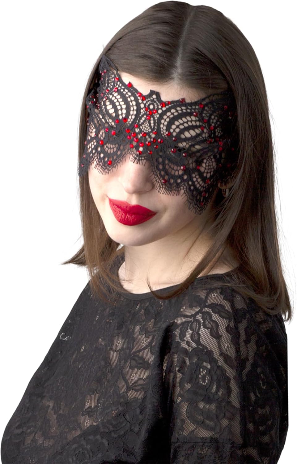 This handmade black lace masquerade mask is designed for women who appreciate refined detail and expressive style. The full-coverage lace design has no eye cutouts, yet provides excellent visibility through the delicate lace pattern, allowing comfort and confidence during wear. Measuring approximately 32 × 16 cm (12.6 × 6.3 inches), the mask features a butterfly-inspired silhouette that frames the face gracefully. Two wide satin ribbons (2.5 cm / 1 inch) ensure a secure and adjustable fit, while reinforced hand stitching at the attachment points adds durability. Red rhinestones in two complementary sizes are carefully placed across the lace surface, creating a subtle shimmer and dramatic depth without overpowering the design. A hand-sewn black floral embellishment with beadwork completes the look, highlighting the craftsmanship behind each piece. Perfect for masquerade balls, cosplay events, carnival celebrations, Valentine’s Day, themed parties, photo sessions, theatrical performances, and elegant private evenings where mood and aesthetics matter.