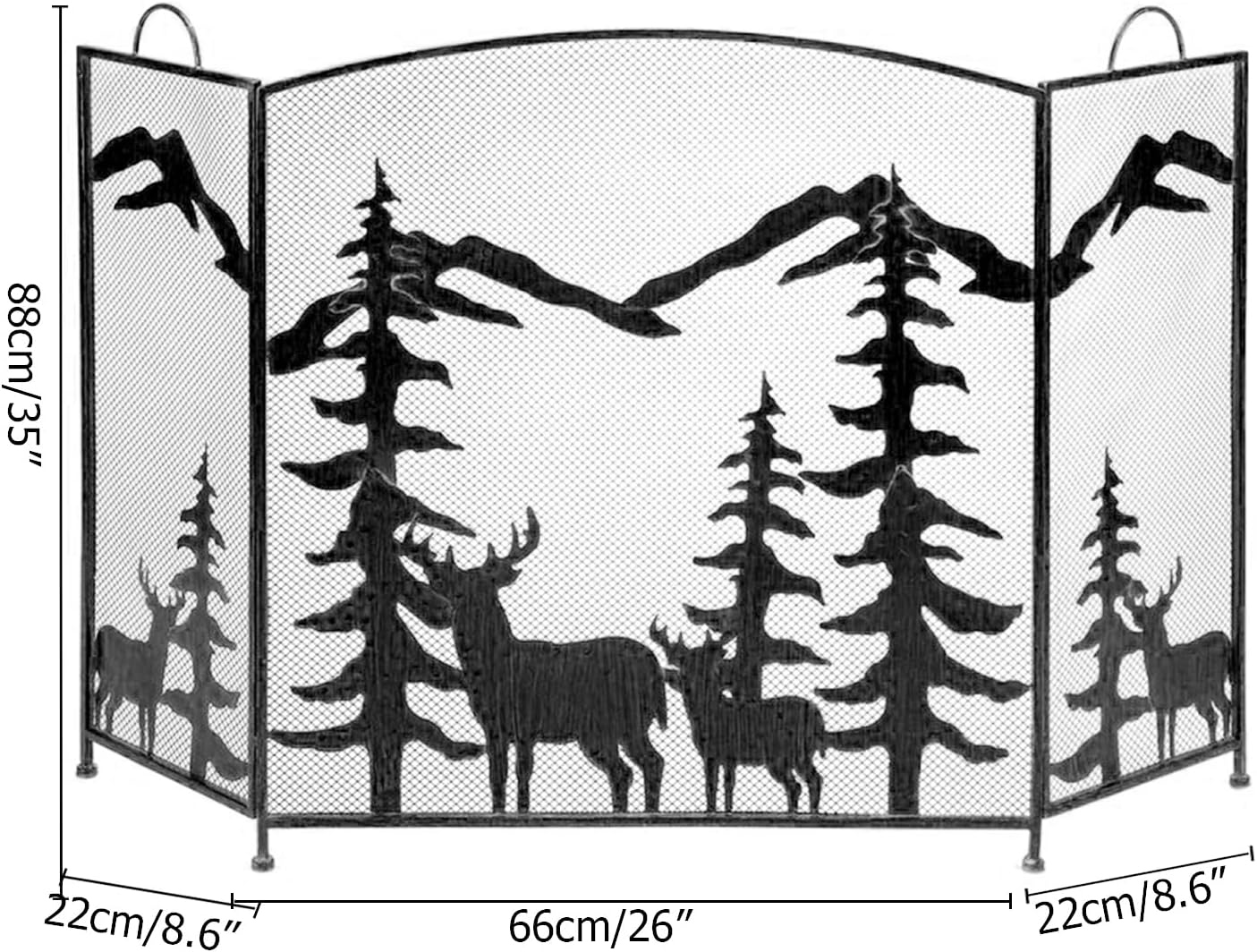 BOOMLATU Black Metal Mesh 3 Panel Fireplace Screen with Handle,Showcasing The Carved Metal Moose Through The Pine Trees for Home Decor Feature: Match this exquisite fireplace frame screen in a classic, timeless finish with your vintage living room décor to create a perfect rural-style environment. Ideal for a hill cabin, or mountain lodge, this foldable fireplace screen is a must-have. The BOOMLATU Fireplace Screen is beautifully crafted out of iron and highlights ornate design work on the face of the screen. The sophistication of this fireplace screen adds a refined look to any fireplace filled room. Perfect for storing, drying or displaying firewood, fit on porch, deck, Under worthy fire screen - perfect for home decor, fireplace grates. It’s foldable functionality provides it a great edge and can be set aside when not in use. Specification: Size:43.2 x 2 x 35in(L x W x H) Weight:20 lbs Material:Matel Color:Black Package includes:1*fireplace screen Warm tips: Due to different monitors, the actual color of the item may be slightly different from the picture displayed on the website. The size is manually measured, so please allow a slight deviation within 0.5 inches. As it is a handmade product, some minor flaws are normal designs. This should be known in advance. If the product fails to satisfy you for any reason, please contact us in time and we will provide you with 100% high-quality after-sales service.