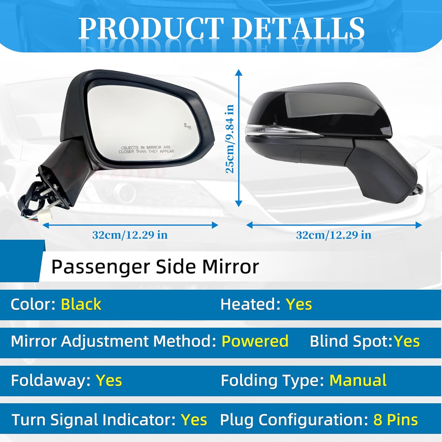 For Toyota Rav4 Side Mirror Replacement Color: Black Heated: Yes Mirror Adjustment Method: Powered Foldaway: Yes Folding Type: Manual Turn Signal Indicator: Yes Blind Spot:Yes Plug Configuration: 8 Pins Package Includes: 1 x Passenger Side Mirror(Right Side) Reference #'s TO1320384 TO1320388 879400R271 879450R140 Compatible models: For Toyota Rav4 2016 2017 2018 2019 2020 2021 2022 Side Mirror For Rav4 Side Mirror Due to the differences in different years and models, please confirm your original size before purchase to avoid purchasing error