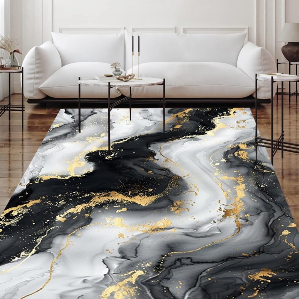 Elevate your space with this exquisite black, gold, and gray marble-textured indoor rug, designed to bring luxury and sophistication to any room. Crafted with premium materials, this plush yet durable rug offers a soft underfoot feel while ensuring long-lasting performance. Its non-slip backing provides safety and stability, making it ideal for high-traffic areas like living rooms, bedrooms, offices, or entryways. The striking marble-inspired pattern in rich black, shimmering gold, and elegant gray creates a bold yet timeless statement, blending seamlessly with modern, contemporary, or classic decor. Whether you're looking to add a touch of opulence or a unique focal point, this high-end rug delivers both style and functionality, transforming your space into a refined and inviting haven.