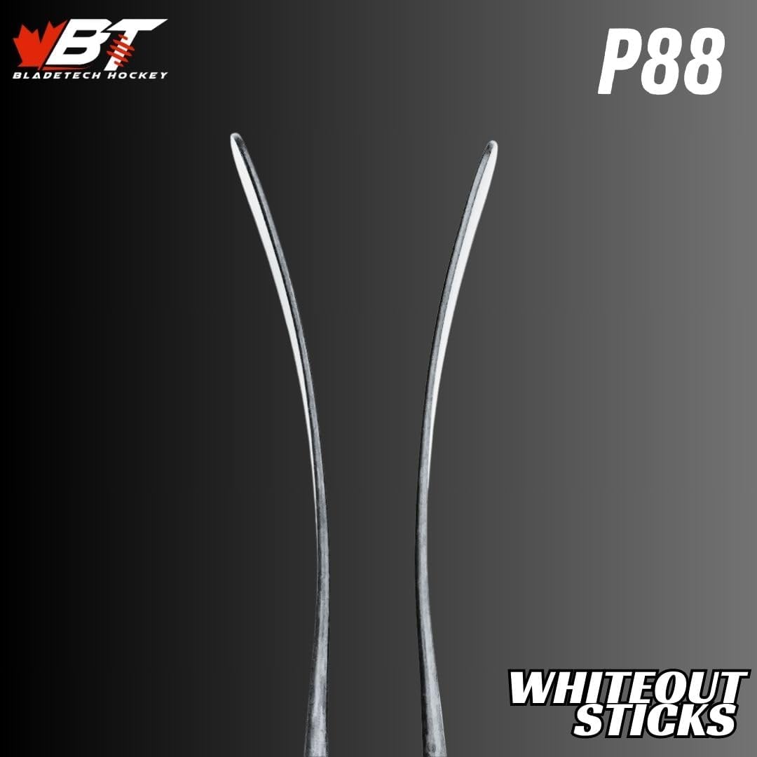 Get pro sticks at pro prices! Pure 100% carbon fibre that's designed for the best performance. The Bladetech Whiteout does not compromise: the same top end stick, with no costly stickers. We offer a variety of curves and flexes to get you dialed in. Bundle with another stick or blades for the ultimate Hockey Performance Package! FEATURES: 400 grams! (want to see what else weighs 400 grams? Weightofstuff.com) 100% Carbon Fiber Grip Finish Shaft Low Kick Sr. Flexes = 67, 77, 87, 95 Height 66" Standard Lie: 5.5° No warranty on Whiteout sticks... so buy 2 (use WHITEOUT for a discount on multiple sticks) CURVES: P92 (same as P29, W03, TC2, TC2.5) (Crosby, Henrique, Sakic, Matthews) P28 (same as W28, TC3, TC4) (McDavid, Eichel, Gallagher) P88 (same as P80, W88, MC) (P. Kane, Ovechkin, Gaudreau, Lindros) P90TM (Tavares, Benn)