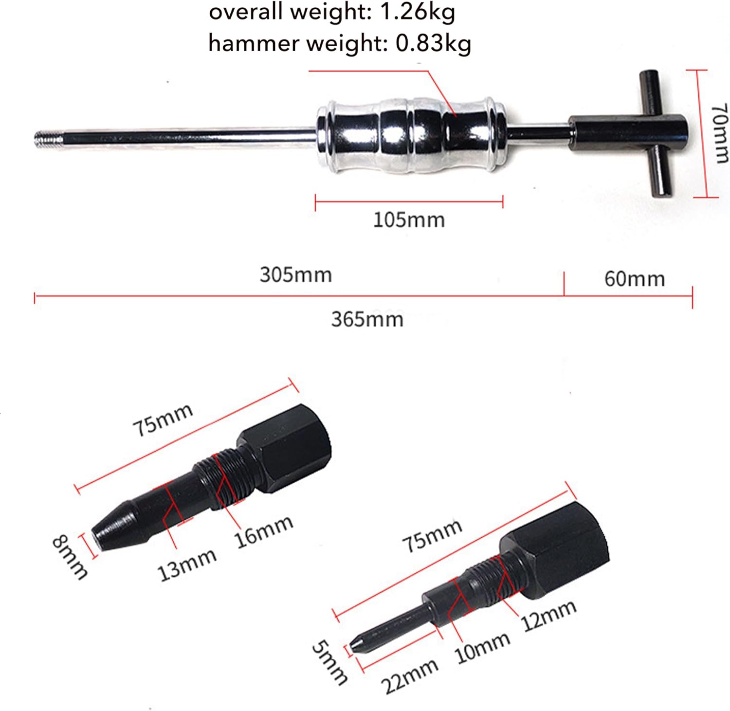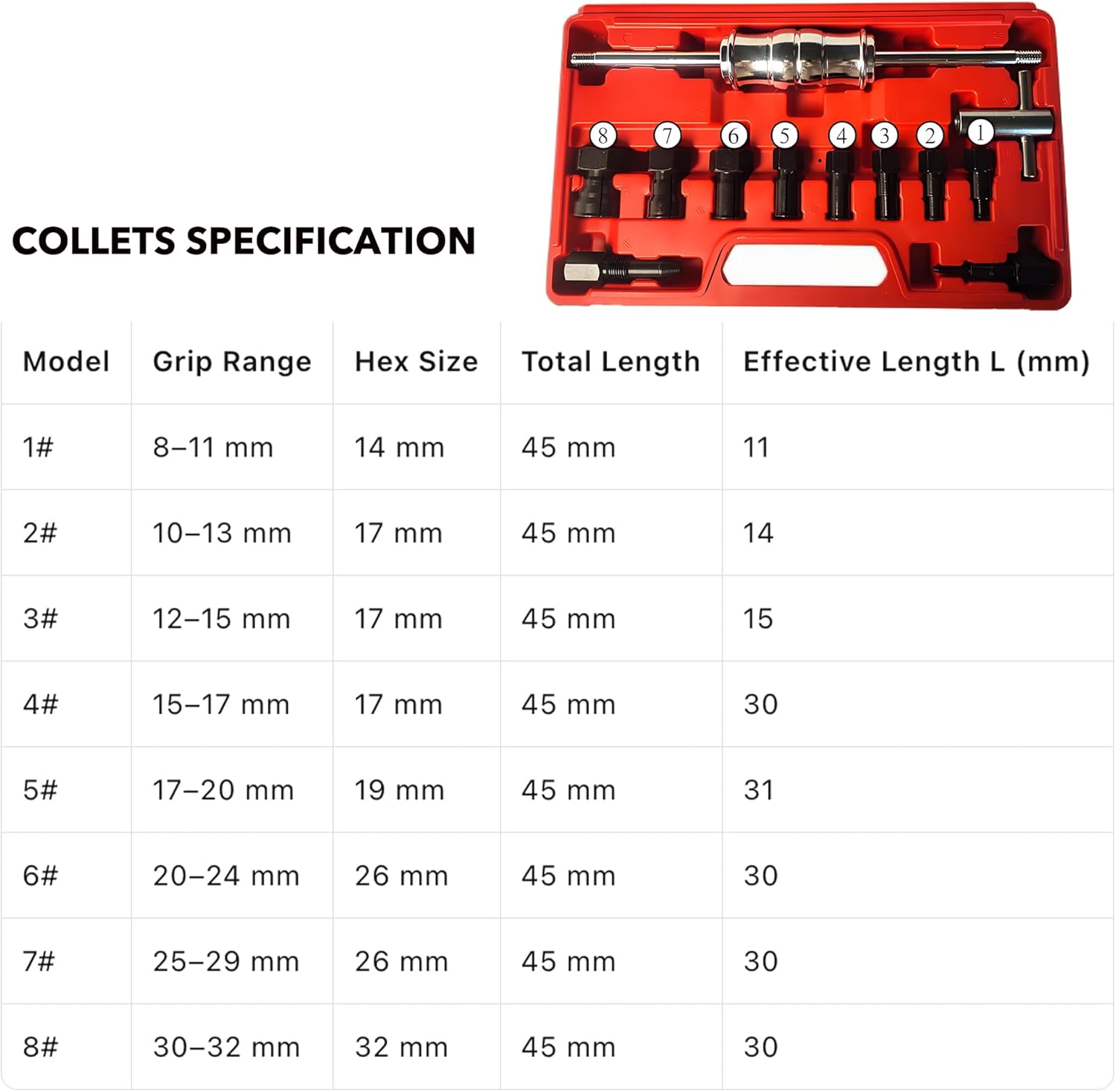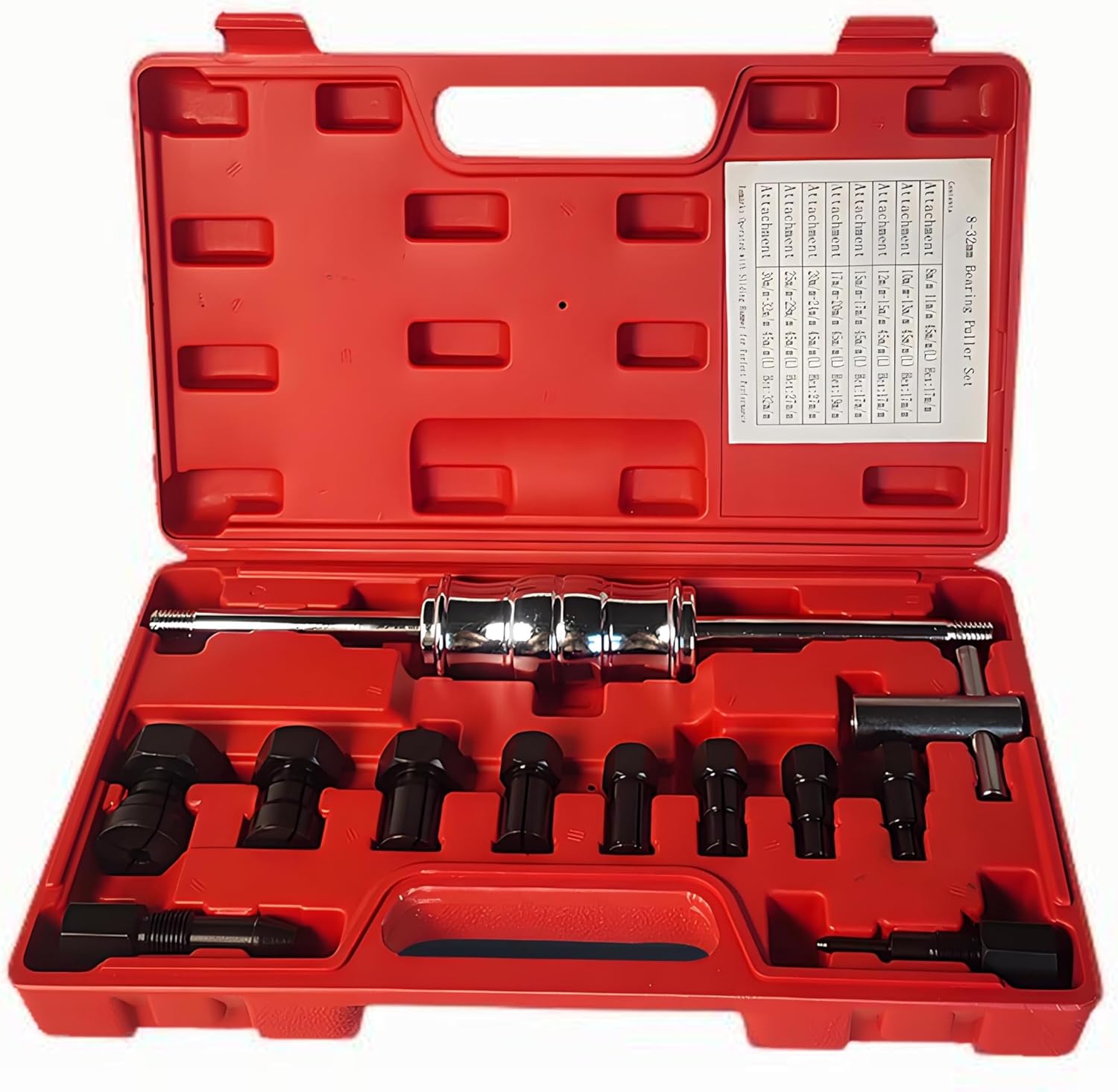 SPECIFICATION- Collets: 8 expandable pieces, 8–32 mm (5⁄16"–1¼") - Slide-hammer length: 1.2 ft / 360 mm - Material: carbon steel- Case Size: 13.2*7.6*2.4in- Weight: 5.6lbsPACKAGE- 1*slide hammer- 8*collets- 2*adjusting valvesOperationPick the right-sized collet, then tighten the nut until it grips the bearing firmly.Attach the slide-hammer, give the handle a twist to lock it, and hammer the weight outward along the shaft to pop the bearing free.Typical jobs this kit tackles - Pull wheel, pilot, and transmission bearings - Extract stubborn alternator & power-steering pulleys - Remove bushings, seals, and sleeve bearings from blind holes - Pop out stuck generator & A/C clutch hubs - Service motorcycle/ATV wheel and swing-arm bearings