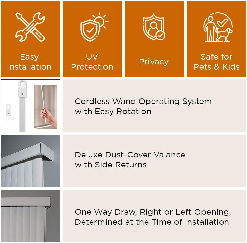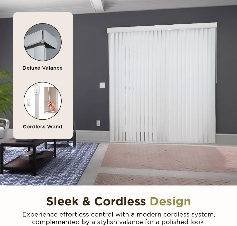 About BlindDen's Vinyl Vertical Blinds Enhance your home’s comfort and style with our Vinyl Vertical Blinds, a perfect blend of durability, long life, ease of use, and modern design. Crafted from high-quality North American-made PVC/vinyl, these blinds deliver reliable UV protection and privacy, ensuring each room remains cool and shaded from intense sunlight. Ideal for a range of spaces, from living room, dining room, bedroom, or patio doors, they provide excellent room darkening to reduce glare, heat and UV rays, and control light for any occasion. The cordless wand operating system offers a safer, cleaner option by eliminating cords, making these blinds ideal for homes with children and pets. Constructed with a heavy-duty custom aluminum headrail, these living room blinds are built to withstand years of daily use. Installation is simple with custom sizing options to ensure a seamless fit, while the included deluxe dustcover valance adds a sleek, finished appearance to your windows. Designed to fit the demands of any lifestyle, these window vertical blinds are easy to maintain, resisting dirt and pet claws, and they can be sized or custom ordered for a variety of window types. With one-way draw options for either right or left opening, our window blinds offer flexibility and convenience in any room. Choose these vinyl vertical blinds for a long-lasting, stylish, and practical addition to your home decor! Specifications Color: Wood-Look White Width: 36” to 90” Length: 48”, 60”, 72”, and 84”