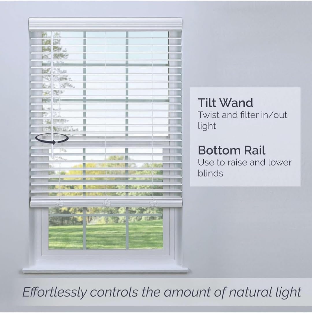 Transform your windows with these sophisticated 2-inch faux wood horizontal blinds, offering both style and functionality for your home. These cordless blinds provide a clean, modern look while ensuring child and pet safety. The crisp white finish complements any décor style, from traditional to contemporary. The versatile design allows for either inside or outside mounting, adapting perfectly to your window frame. Each blind is customizable to fit your specific window dimensions, ensuring a perfect fit every time. The durable faux wood construction offers the elegant appearance of real wood while being more resistant to moisture and temperature variations. The horizontal slats provide precise light control, allowing you to easily adjust the amount of natural light and privacy in your space. The cordless lift mechanism operates smoothly and consistently, making these blinds both practical and aesthetically pleasing for any room in your home.