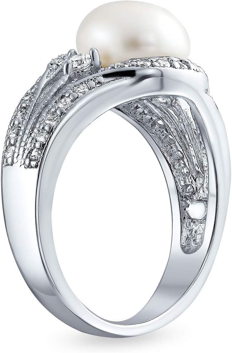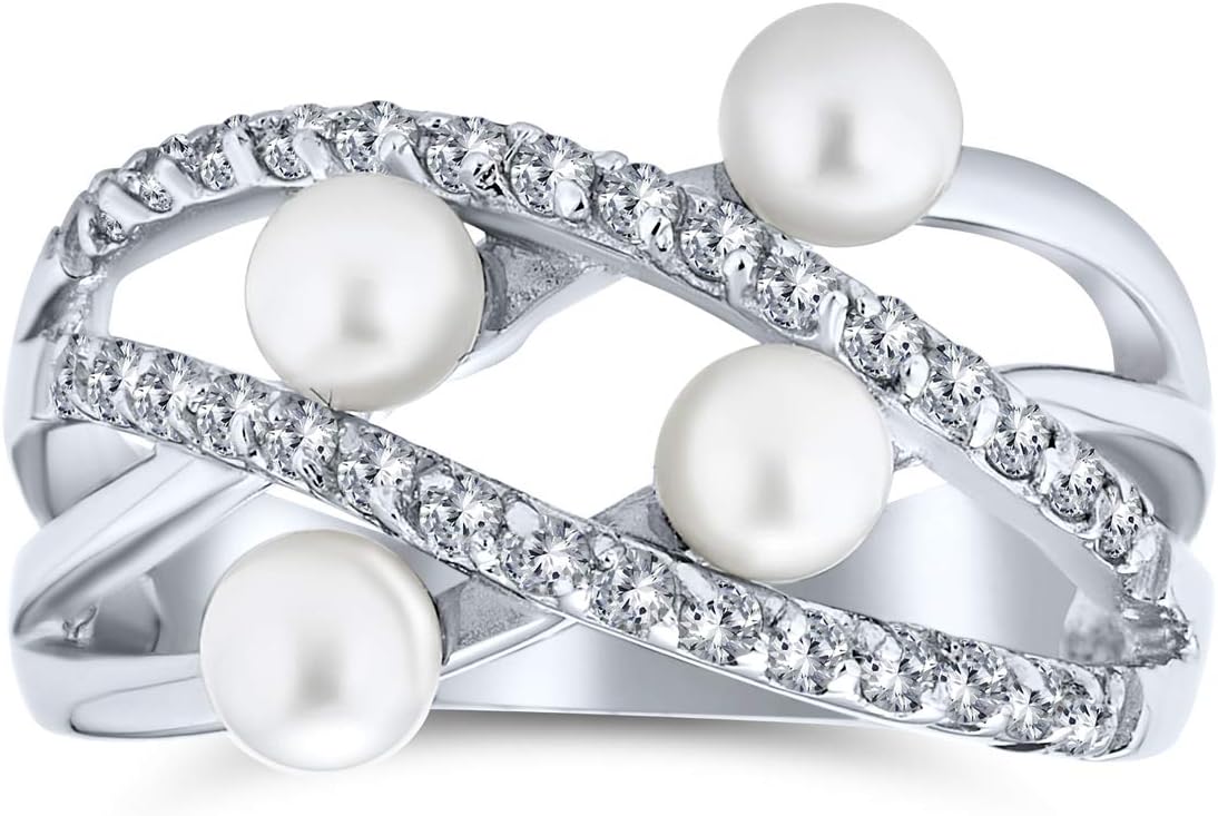 Enhance your style with our iridescent freshwater cultured pearl rings this season. Our sterling silver pearl ring adds an elegant glow to any outfit. The cluster setting features three shimmering CZs on each side of the freshwater button pearl. This detail adds a hint of elegance to our pearl jewelry. Perfect for June brides, this stunning CZ cluster engagement ring is a superb choice. Made of sterling silver and rhodium plated, it resists tarnish and maintains its high polish. Consider button pearl jewelry for your wedding party.
