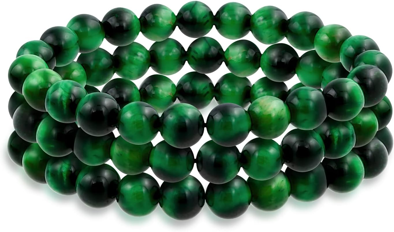 Discover our stunning and exotic Beaded Gemstone Stretch Bracelet Set. These affordable gemstone bracelets enhance self-control and determination. Fits a 6.5-inch wrist. Crafted with 32 8mm round gemstone beads on a stretchable strand. Comes in a set of 3 for stylish, stackable wear. Perfect to match any outfit in your wardrobe. This glamorous charm bracelet will make you shine with elegance. Ideal unisex gift for Father's Day or any holiday.