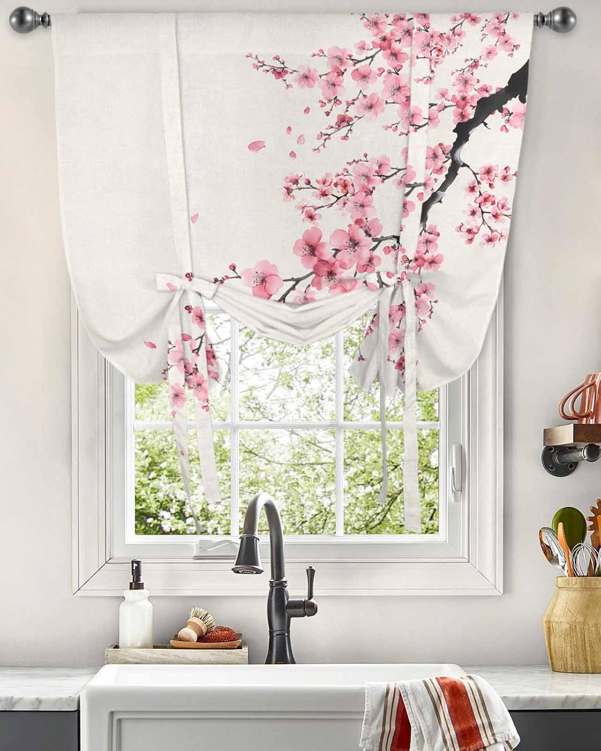 Liven up any small window with this curtain panel, providing just enough privacy, window covering, for your everyday needs.You can tie the functional straps at different heights for an eye-catching look. Impress your friends and family with these window treatments.Innovative Door Window DecorElegant bathroom curtains bows tie up shade is upgraded from normal style, 4 adjustable straps are on the back, it can be tied to create a pleated effect, or can be tied to block some sunlight, it will decorate your indoor windows and rooms with a new great effect.Suitable for Halloween, Thanksgiving, Christmas, New Year, etc., dress up this tie-up curtain. Add your personalized and customized holiday atmosphere.Tieup Shades Drape DetailsDimension34x45in about 86x115cm42x45in about 107x115cm42x54in about 107x137cm42x63in about 107x160cm46x63in about 117x160cm52x45in about 135x115cm52x63in about 135x160cmWe did manual measurement, there may be 1-3cm error. Hope to get your understanding.Please measure the size of the window before buying to make sure the adjustable balloon rod pocket curtain are the right size.CraftsmanshipCareful stitching prevents loose threads and puckered hem.Machine washable in cold gentle cycle, tumble dry low, do not bleach.Easy InstallationSewn with 4" rod pockets, perfectly accommodates 2" diameter curtain rods.Frequently Asked Questions Are Listed Below:Q: How do you tie them up?A:The decoration steps are as described in the pictures. Due to lighting effects, monitor brightness and other factors, the color tone of the website photos and the actual product may be slightly different.Q: Is the curtain privacy strong enough?A:If you take this tie down curtain all the way down, it is enough to protect your privacy. But not completely blackout. There will be light filtering.