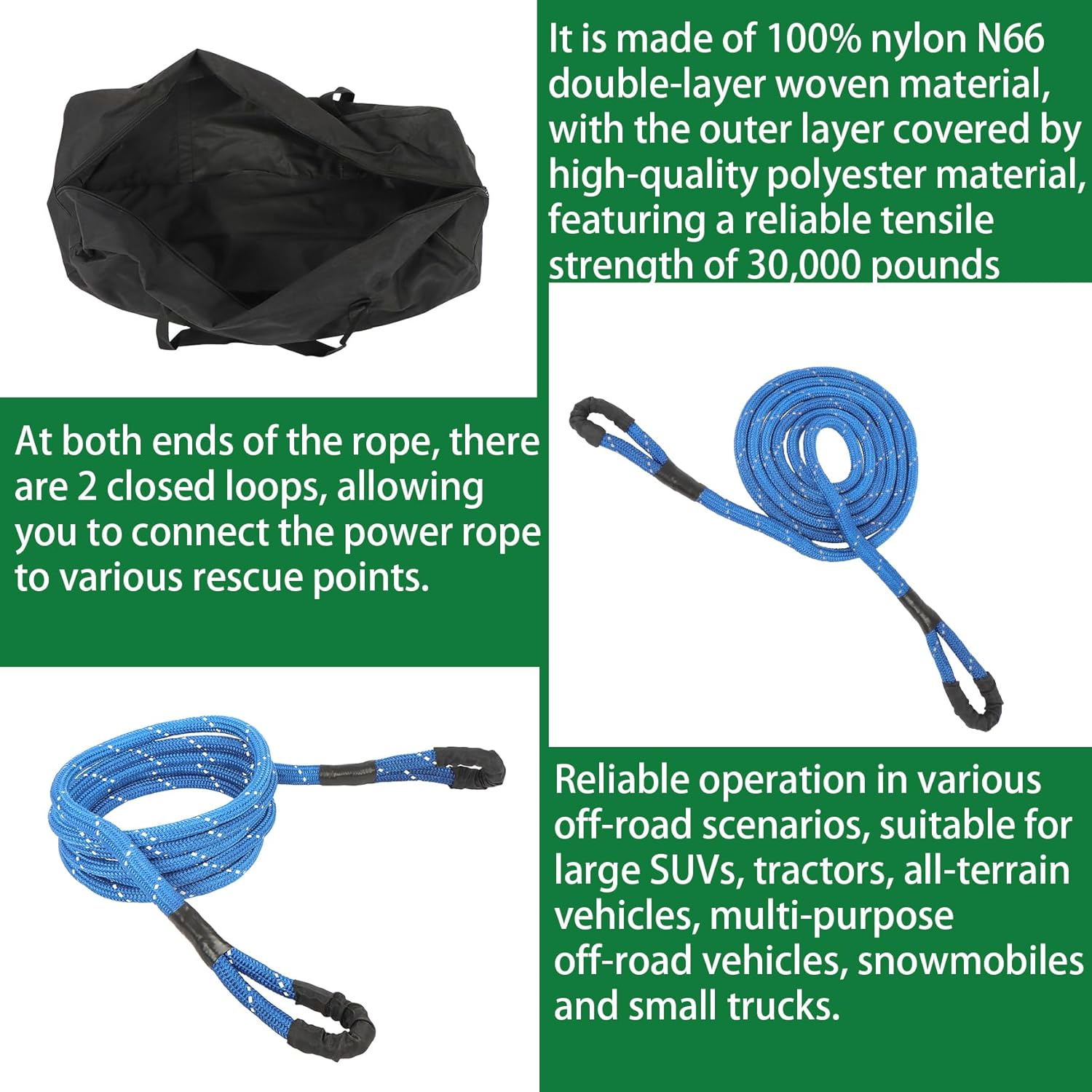 Blue 7/8" x 30ft Power Recovery Rope, Nylon N66 Double-layer Weaving, 30000 Pounds Breaking Strength for Offroad Vehicle SUV ATV UTV Tractor Elastic Ropes KitWorking principleIf a four-wheel vehicle gets stuck in a muddy area, an off-road vehicle loses its tire grip on the sand dunes, and a vehicle is unable to overcome the boulders due to insufficient engine torque, by fixing the two ends of this set of kinetic traction ropes to the two vehicles, the kinetic gripping force of it can solve all these problems.FeaturesIt is made of 100% nylon N66 double-layer woven material, with the outer layer covered by quality polyester material, featuring a reliable tensile strength of 30,000 pounds. At both ends of the rope, there are 2 closed loops, allowing you to connect the power rope to various rescue points. These soft loops are more sturdy than traditional metal D-shaped rings.This 30-foot off-road kinetic rescue rope is made of high-strength nylon material, featuring excellent elasticity and not prone to wear and tear, with an elongation rate of up to 30%. This enables it to effectively tow vehicles stuck in muddy, sandy, snowy or steep terrain, while not transmitting excessive impact force, minimizing the risk of vehicle damage.ApplicableEnsure reliable operation in various off-road scenarios, suitable for large SUVs, tractors, all-terrain vehicles, multi-purpose off-road vehicles, snowmobiles and small trucks.SpecificationColor: blue Material: polyester+Nylon N66Package included: 7/8" x 30ft Power Recovery Rope