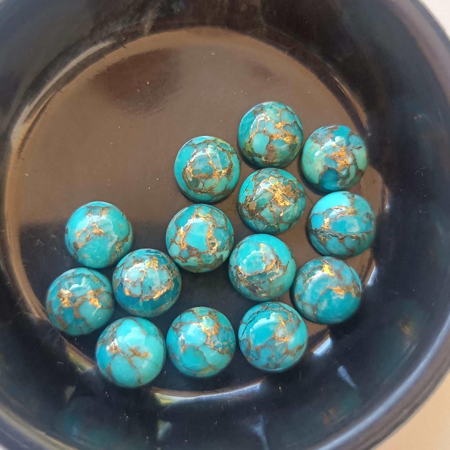 Add striking color and luxury to your jewelry designs with this Blue Copper Turquoise Round Calibrated Cabochon Lot. These gorgeous flat-back cabochons feature vibrant shades of electric blue interlaced with bold copper matrix patterns, giving each gemstone a distinct and eye-catching appearance. Ideal for artisan jewelers and creative DIY makers, these Mohave turquoise stones are a stunning fusion of natural turquoise and copper, designed to elevate your handmade pieces. Available in multiple sizes—4mm, 5mm, 6mm, 7mm, 8mm, 9mm, 10mm, and 12mm—this lot provides perfect versatility for creating rings, earrings, pendants, bracelets, and more. Each stone is calibrated for consistent sizing, making them ideal for sets or symmetrical designs. The flat-back style makes them easy to set into bezels or mount onto custom backings, making your workflow smoother and more professional. Whether you’re designing bold statement jewelry or subtle everyday pieces, these cabochons will add a luxurious touch. The vibrant blue tones are enriched with veins of gold and copper matrix, producing a high-impact aesthetic that pairs beautifully with silver, gold, or copper findings.