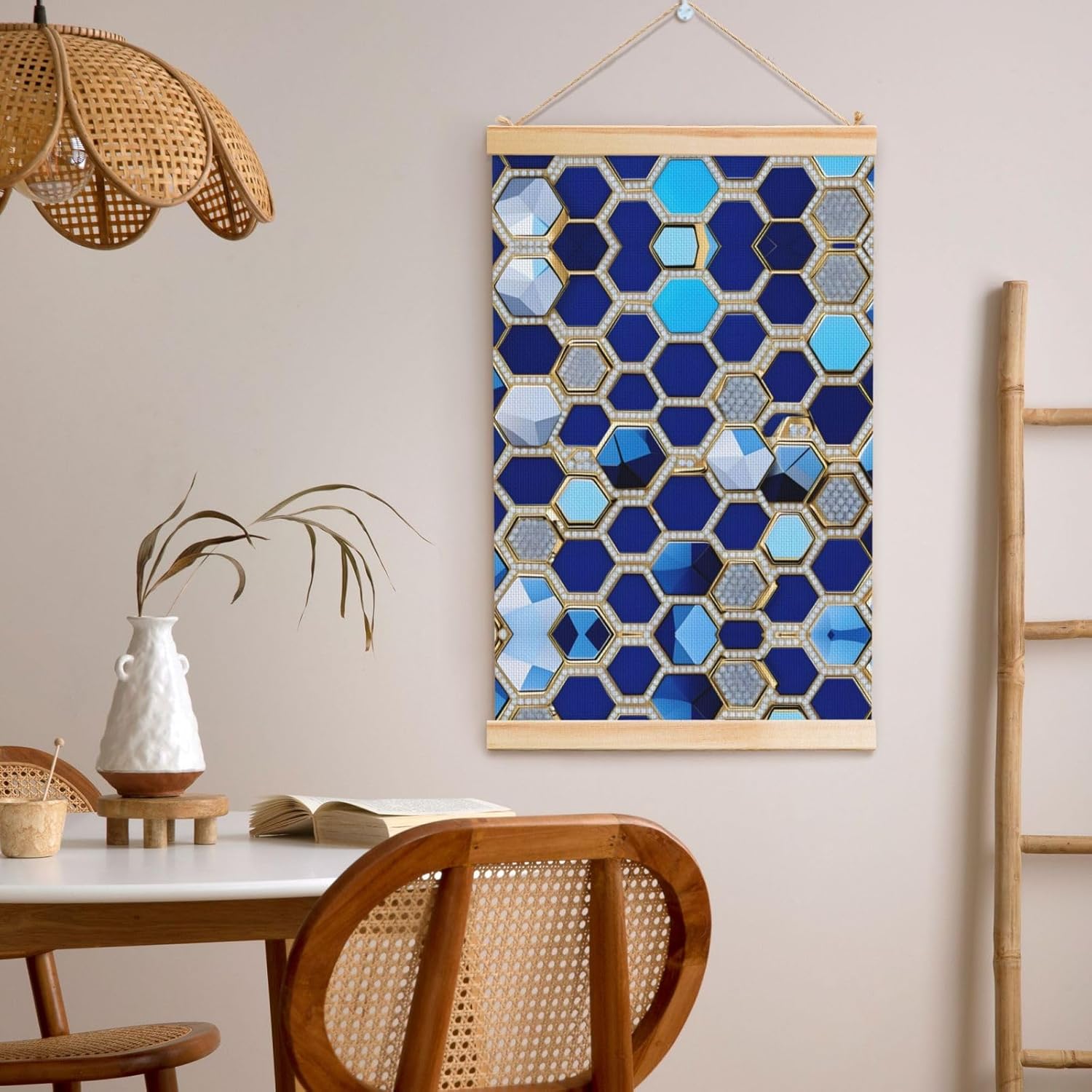 Our Blue Hexagons And Diamond Print Wooden Poster Hanger Is An Excellent Addition To Your Home Decor Or A Perfect Gift For Friends And Family. Made Of Selected Quality Canvas With Brilliant And Enduring Colors, This Wall Art Is Designed To Resist Water, Dust, And Fading, Ensuring The Bright And Vibrant Art Lasts. The Polyester Is Enclosed Between Two Teak Wood Hanger Scrolls With An Attached 35cm Rope For Easy Hanging. Installation Is Made Simple With The Included Two Nails In A Plastic Box. The Modern Minimalist Style Of Our Wall Hanging Complements Any Home Decor, Elevating The Artistic Ambiance And Brightening Up The Room. Experience The Elegant Transformation This Wall Hanging Scroll Painting Brings To Your Spaces Today.