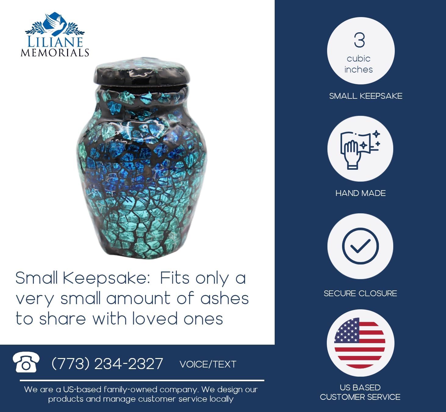 HANDCRAFTED miniature keepsake cremation urn. Each individual urn is a unique work of art to commemorate a beautiful soul. Hand applied and glued blue glass tiles form a brilliant pattern that is as unique as your loved one. Includes a black velvet storage or gift bag. KEEPSAKE SIZE is designed for sharing a small portion (3 cubic inches / 3 tablespoons) of cremated remains ashes among family members. Can hold human cremains or ash of a pet, a flower petal, earth from a gravesite or a lock of hair.SCATTERING CEREMONY: Perfect for keeping a small memento after a scattering ceremony. Keep a small amount of remains, sand from a beach, soil from urn burial location, or water from the ocean or river where scattering ceremony took place.Quality you can feelEach urn is handcrafted by an experienced artisan in India. Made in metal for indoor use, the urn is made with hand-applied glass pieces and finished in a beautiful shiny lacquer that will not tarnish or fade. SAFE STORAGEMade with a secure metal screw lid to ensure safe keepsake.IMPORTANT This is a keepsake or token urn that measures just under 3" in height and fits approximately 3 cubic inches. Liliane Collection carries a full line of full size urns on Amazon (including matching mosaic urns)THIS IS A SMALL MINIATURE URN THAT FITS A VERY SMALL AMOUNT OF CREMAINS