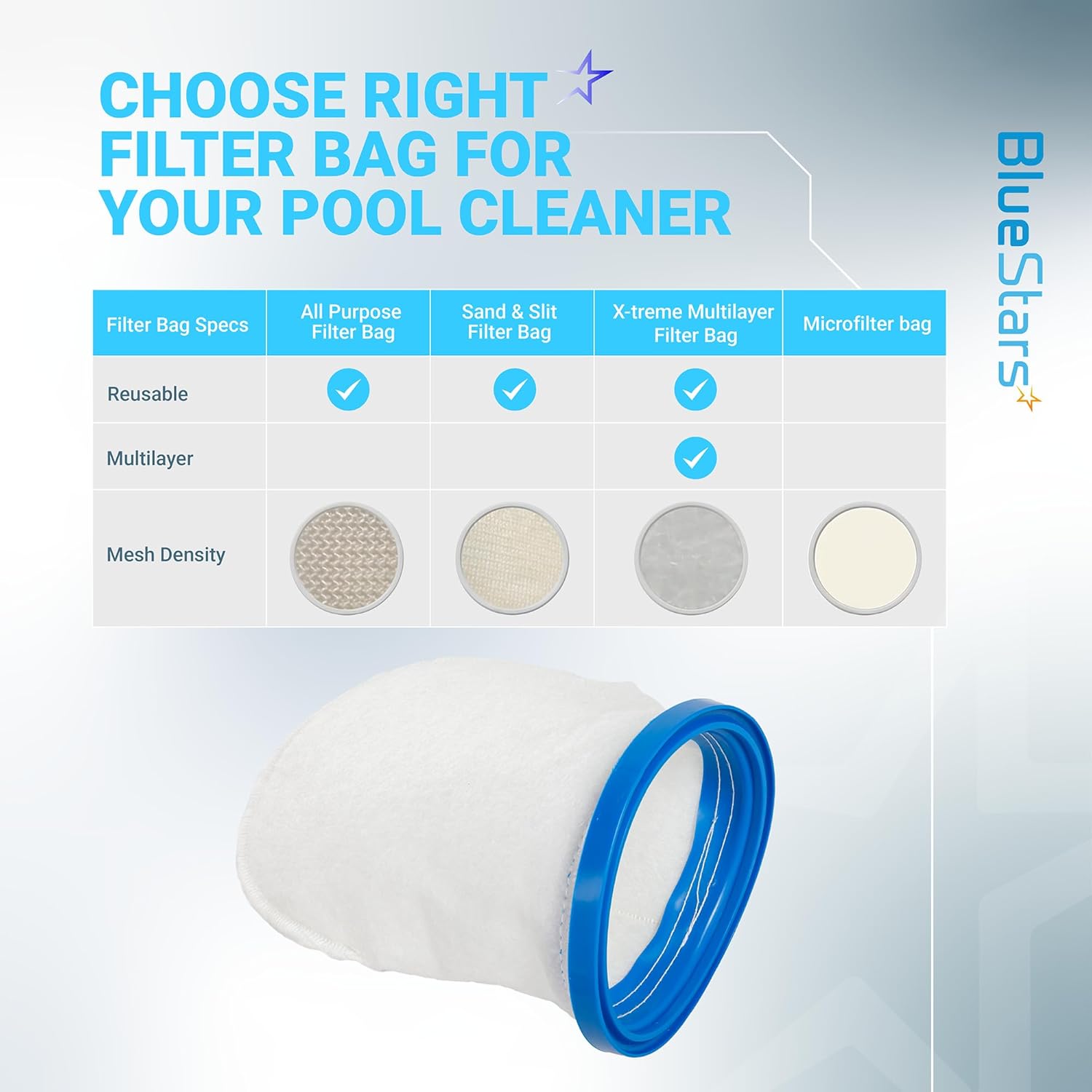 Efficient Multilayer Pool Vacuum Filter Bags for Better Cleaning Maintain a cleaner pool with the BlueStars P30X022XF multilayer pool vacuum filter bags, designed to improve debris collection for compatible handheld vacuums like Pool Blaster Max, Catfish Ultra, iVAC 250, Volt FX-4, and Jacuzzi JPV200. These pool vacuum filter bags replacement help restore strong suction and reliable cleaning performance when your existing filter bag becomes worn or clogged. Advanced Filtration for Fine and Large Debris The xtreme multilayer filter bag design features layered mesh filtration that captures both large debris and fine particles such as sand, silt, dirt, oils, and plaster dust. This helps reduce leftover sediment and cloudy water after vacuuming, allowing your pool blaster filter bags to support more effective cleaning cycles and clearer pool surfaces. Wide Compatibility with Popular Pool Vacuums These multilayer pool vacuum filter bags replace P30X022XF and PBW022XF and are compatible with multiple models including Pool Blaster Max Li (30000ML), Catfish Ultra (21001DL / 21051DL), iVAC 250 (25000GL / 25050GL), iVAC C2 (IVCF702), Volt FX-4 (24000GL / 24050GL), and Jacuzzi JPV200 (25150GL). A reliable solution for anyone needing filter bags for pool blaster max or other compatible handheld pool cleaners. Durable Reusable Design Built with reinforced stitching and a multilayer mesh structure, this poolvacuum filterbag is designed for routine pool maintenance. The integrated sealing ring helps keep the bag securely positioned while helping reduce debris leakage during operation. Quick and Easy Installation Simply remove the vacuum from the water, open the chamber, replace the used bag, and secure the new bag with the sealing ring. No special tools required, making it easy to maintain optimal performance for your cordless pool vacuum system.