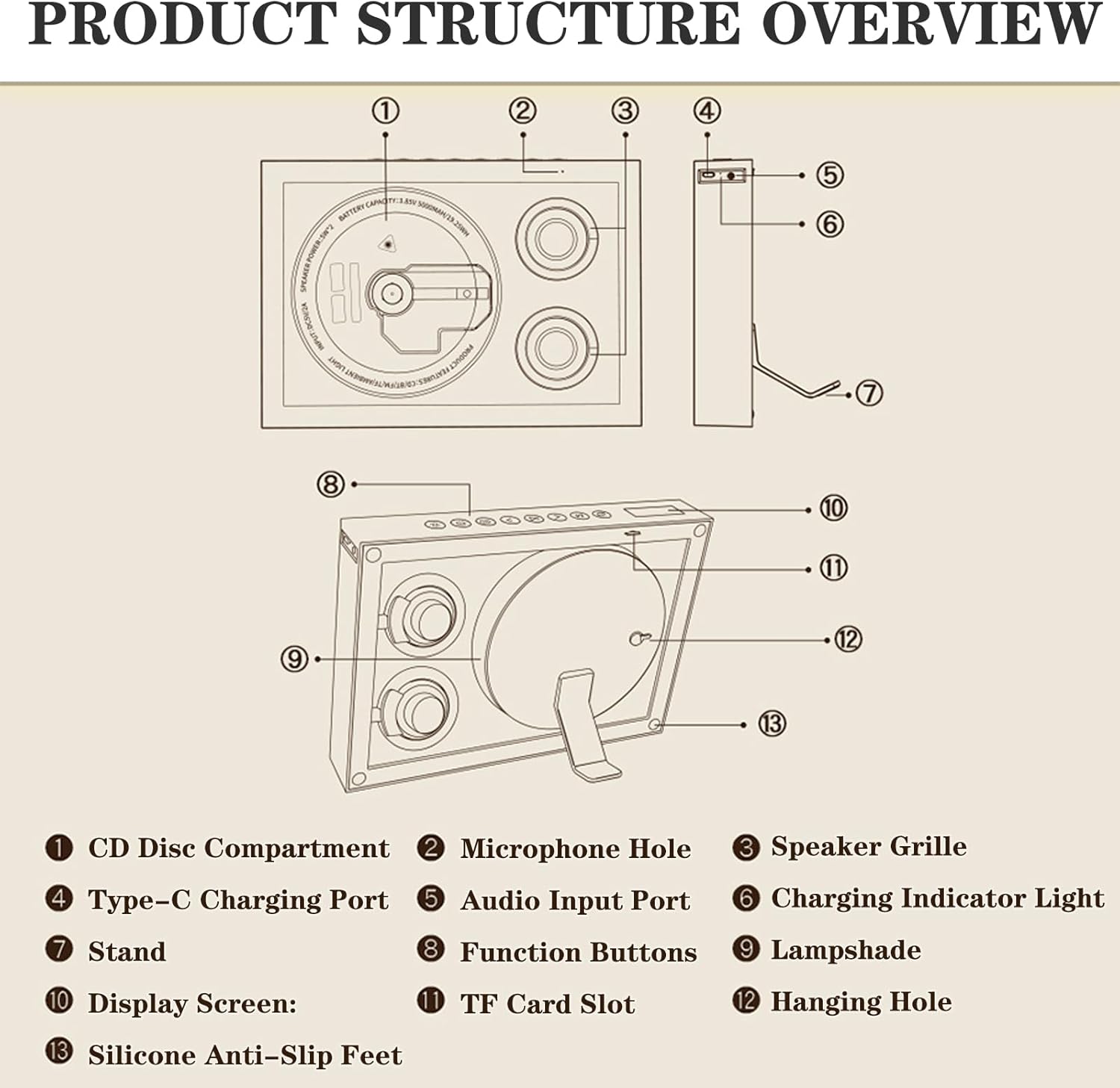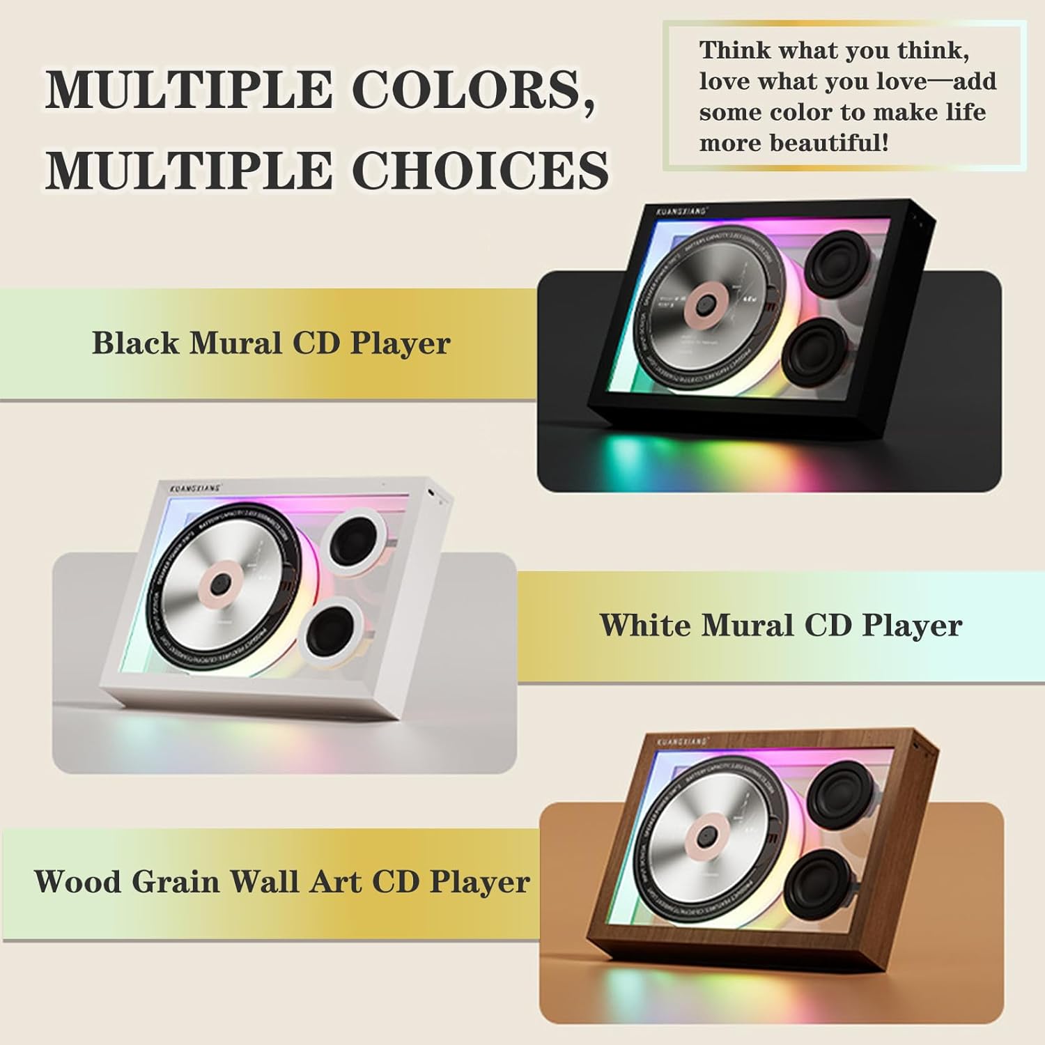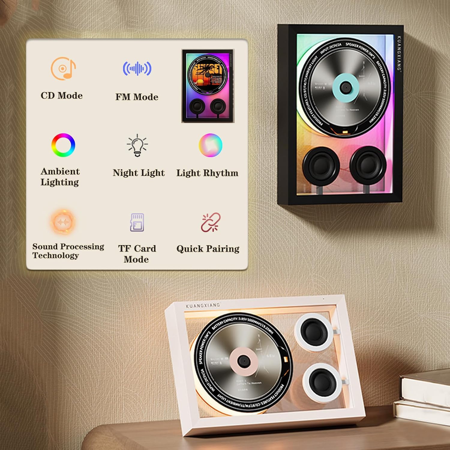 This music CD player combines CD playback functionality with a decorative frame design suitable for home, office, and gallery settings. It serves as both a functional audio device and a visual element for living spaces.Audio SystemSpeakers: Dual 5W built-in speakers for stereo sound outputLED Lighting: Integrated 1W ambient lighting for visual effects during playbackSound Quality: Designed for audio playback across various music formatsPlayback CompatibilityCD Formats: Supports CD, CD-R, and CD-RW discsDigital Formats: Compatible with MP3, WMA, APE, FLAC, LC-AAC, and WAV audio filesVersatile Playback: Plays standard audio CDs and digital music files from compatible discsBluetooth ConnectivityRange: Maximum communication distance approximately Up to 49 ft (15 m)Compatibility: Pairs with smartphones, wireless speakers, and Bluetooth headphonesPower and BatteryBattery Type: Built-in rechargeable batteryBattery Capacity: 5000mAh/3.85V/19.25Wh for extended playbackDesign and ConstructionMaterials: Metal construction for durabilityDimensions: Approximately 280 x 198 x 43 mm / (11" x 7.8" x 1.7")Placement Options: Designed for desktop placementWhat's Included1 x Music CD Player Unit1 x Battery ChargerIntended UseThis CD player is designed for personal audio enjoyment in various indoor settings. It provides a way to play physical CD collections and digital audio files through its built-in speaker system.