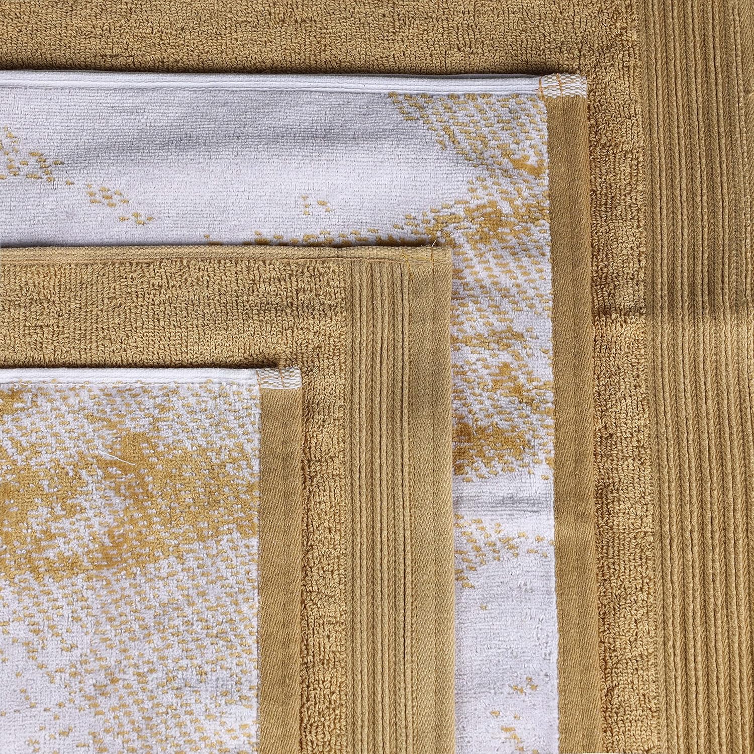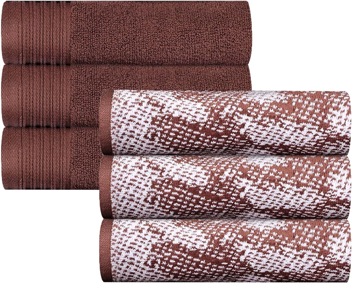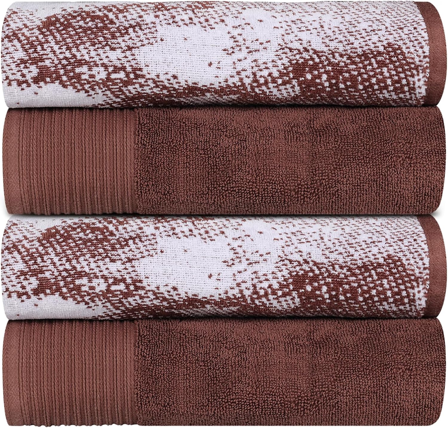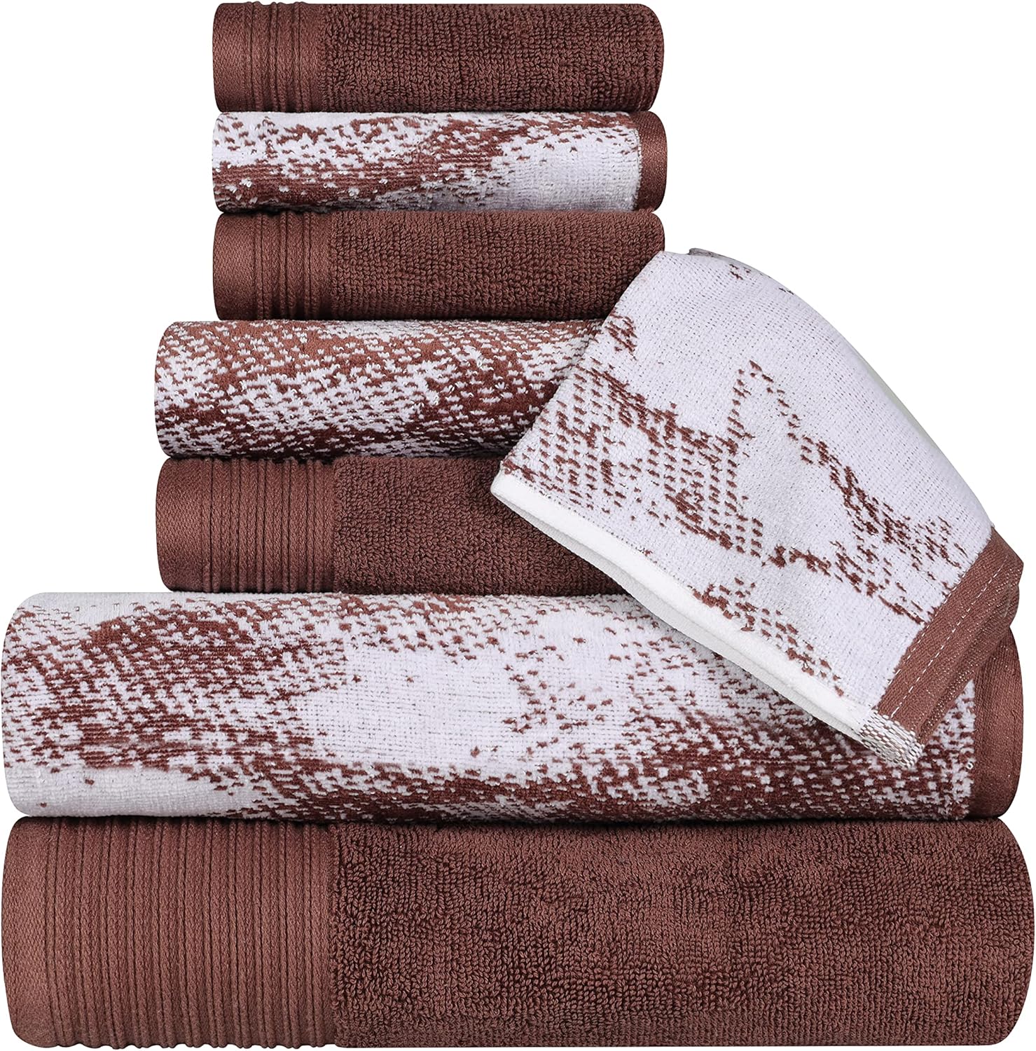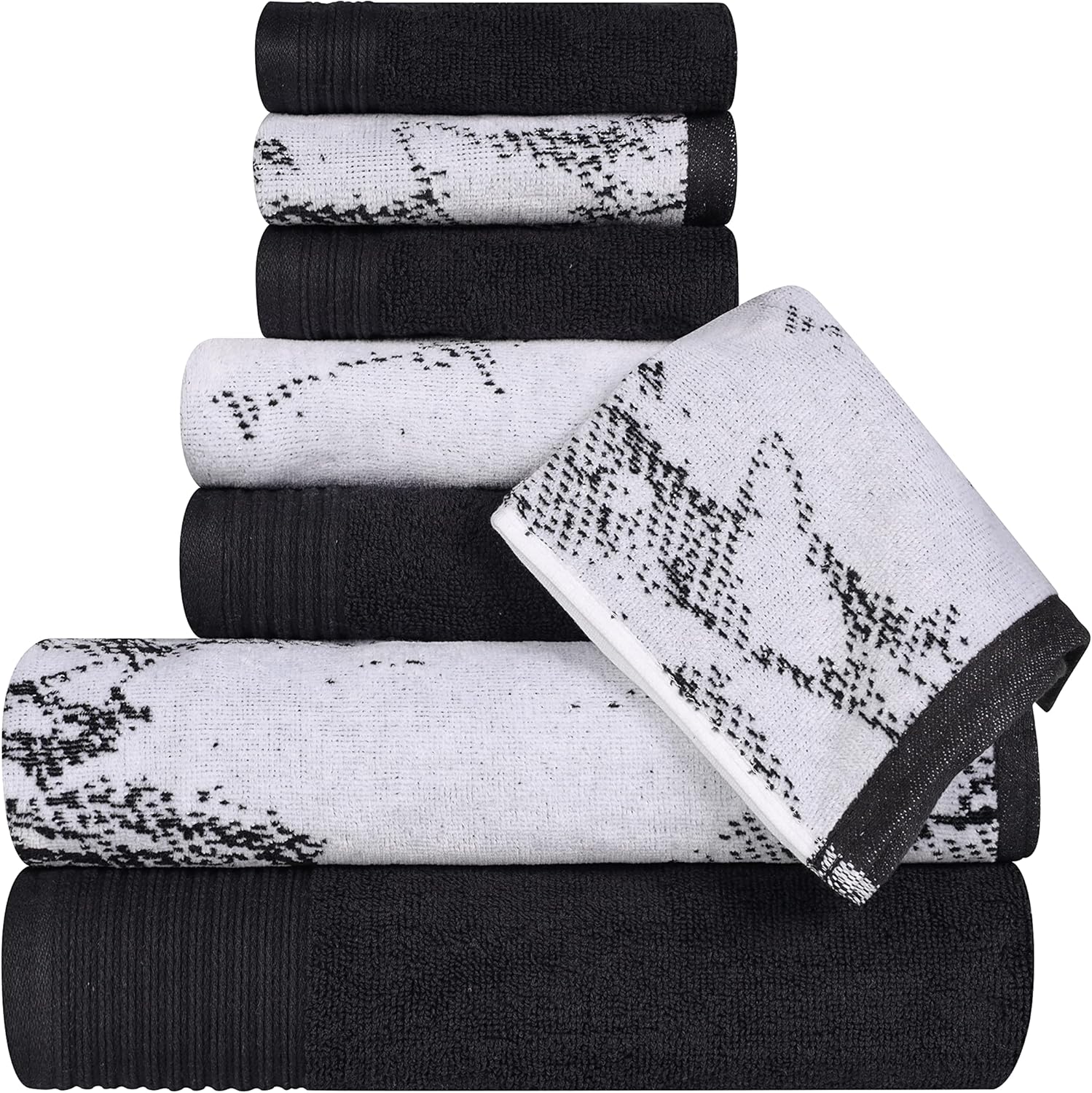 Invigorate your bathroom with the eye-catching pattern and charming hues of the Marble and Solid Cotton Assorted Towel Set by Blue Nile Mills. Our medium weight cotton towels have a double-ply design to provide comfort, durability, and versatile absorption. These plush and fluffy towels will sop up moisture effortlessly, keeping you warm and dry. This bath towel set includes a mix of vibrant solid pattern towels and towels with a contemporary marble effect pattern. Finished with a broad 4 inch rope-textured jacquard border and himmed edges, this towel set exudes elegance and luxury resort style. These striking towels come in a variety of colors, including; black, blue, brown, bronze, cyan, grey, terra cotta red, teal, and white to instantly refresh your bathroom decor.