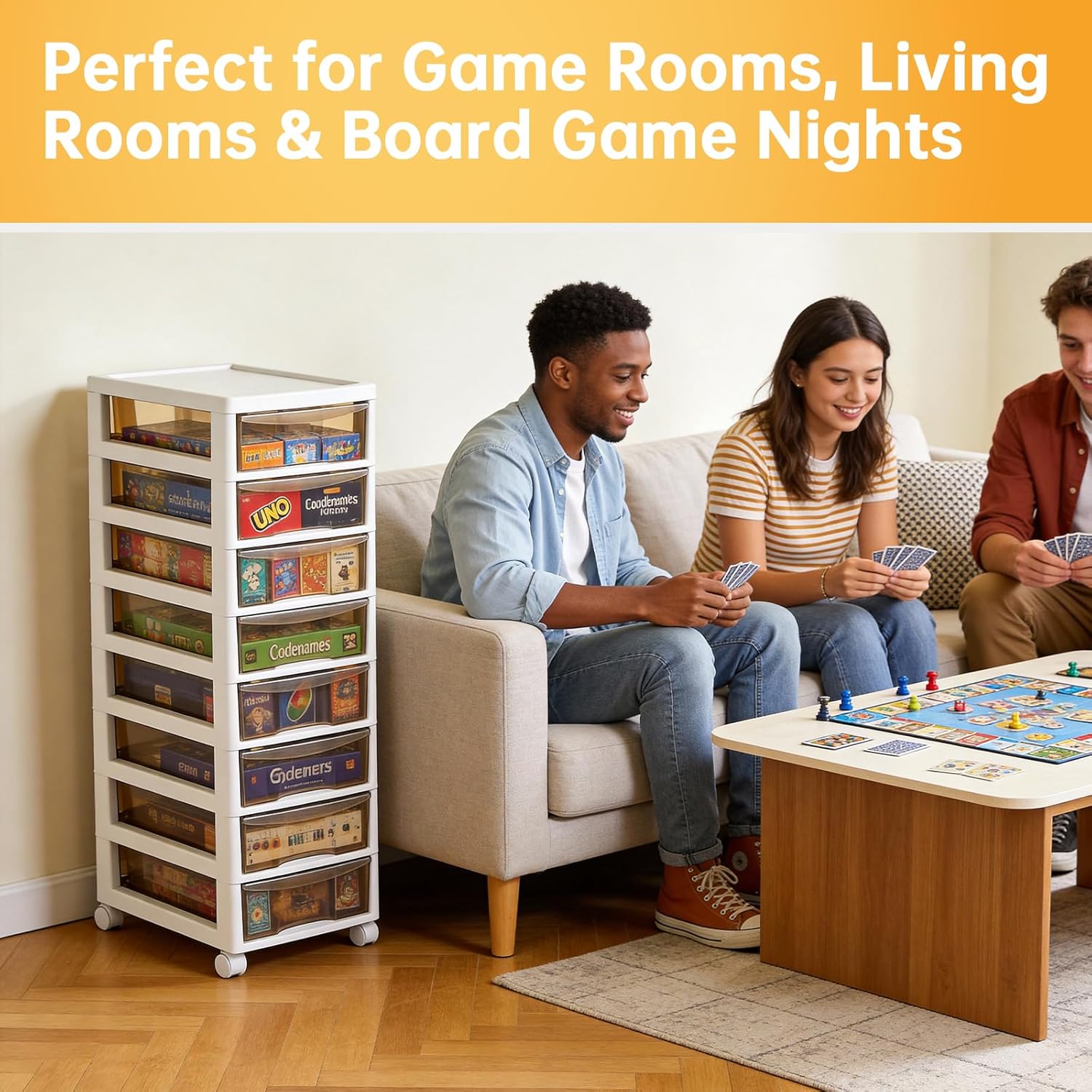 This board game storage cabinet with 8 clear pull-out drawers, lockable wheels, and rounded design offers organized, visible, and versatile board game storage for all your card games and medium-sized board games.