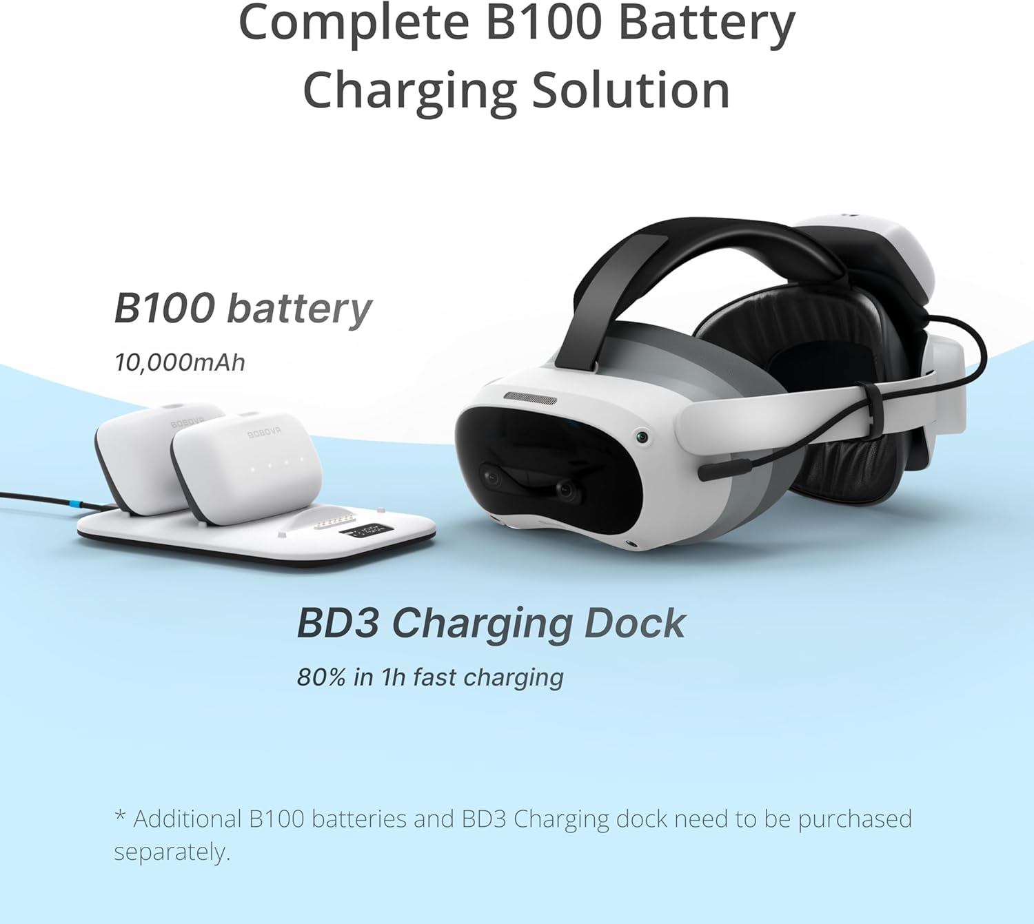Pico 4 Ultra B100 Battery System Elevate your virtual reality experience with the high-capacity B100 Battery System, engineered for extended playtime and seamless convenience. Designed to pair effortlessly with compatible Pico 4 Ultra, this system delivers 120% longer runtime thanks to its dual 5,000 mAh battery modules totaling 10,000 mAh of power. The innovative magnetic hot-swappable design allows instant battery replacements in under 30 seconds—no need to pause your adventure. Simply dock depleted batteries into the included BD3 Charging Dock, which supports 22.5W fast charging to keep replacements ready for uninterrupted sessions. A built-in backlit LED indicator simplifies battery management with intuitive visual cues: a solid glow signals full charge, a pulsing rhythm warns of low power (<20%), and a darkened state confirms a fully drained battery. The ergonomic memory foam head strap ensures all-day comfort by distributing weight evenly across your scalp, reducing pressure points and neck fatigue during marathon gaming or productivity sessions. Ideal for both home entertainment and industrial applications, the B100 combines military-grade durability with user-centric innovations like tool-free maintenance and smart power optimization. Power through your day without limits—whether you’re exploring digital worlds or powering high-demand workflows.