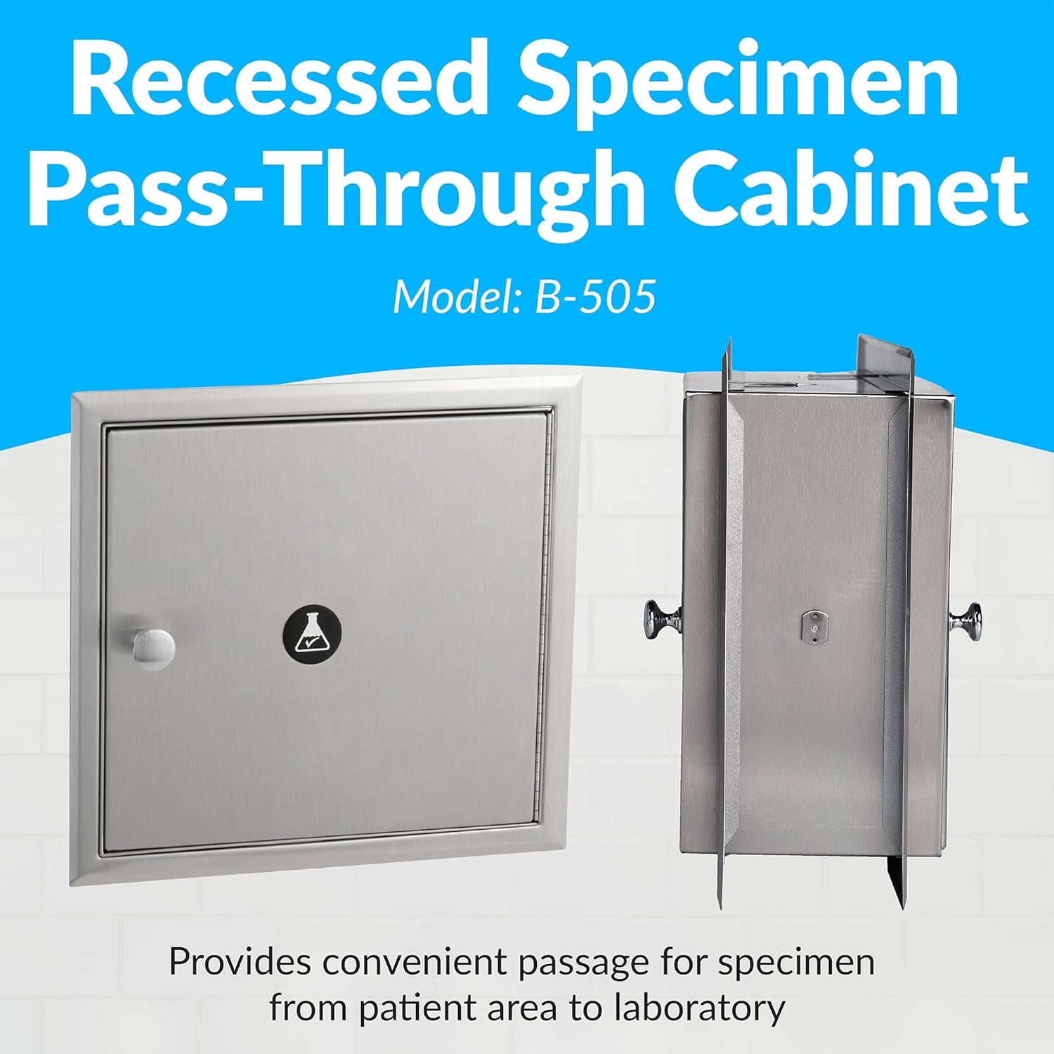Introducing the Bobrick Recessed Specimen Pass-Thru Cabinet (Model B-505), a premium solution designed to facilitate the safe and hygienic transfer of specimens from patient areas to laboratories. This expertly crafted cabinet combines functionality with robust construction, making it an essential addition to medical facilities, hospitals, and laboratories focused on maintaining high standards of cleanliness and privacy. Constructed from high-grade Type 304 stainless steel, the Bobrick B-505 boasts a satin finish that enhances its durability and resistance to corrosion, while also providing a sleek and professional appearance. The cabinet’s all-welded construction ensures long-lasting performance and reliability, even in the most demanding environments. The B-505 features a unique interlocking mechanism on its self-closing doors, designed to prevent both doors from being open at the same time. This critical feature ensures a secure sight barrier, maintaining patient privacy and preventing cross-contamination during specimen transfer. Each door is equipped with a full-length stainless steel piano hinge and a cast-aluminum pull knob, ensuring smooth and reliable operation. The international graphic symbol on the doors clearly identifies the unit’s purpose, enhancing its usability. This specimen pass-thru cabinet is designed for walls with a thickness ranging from 3 inches to 5 3/4 inches. Installation is straightforward, with mounting slots on the top and bottom for easy and secure attachment. Detailed installation instructions are provided to ensure a proper fit and secure mounting, accommodating various wall types and construction features. One of the standout features of the Bobrick B-505 is its removable stainless steel spillage tray. This tray is designed for easy removal and cleaning, promoting a sanitary environment and simplifying maintenance tasks. The seamless, one-piece construction of the cabinet’s flanges further enhances its cleanliness and aesthetic appeal, ensuring no crevices where dirt and germs can accumulate. In addition to its practical features, the Bobrick B-505 is designed with user convenience in mind. The spring-loaded doors are operable with minimal effort, complying with accessible design guidelines and making it easy for healthcare professionals to use the cabinet efficiently. In summary, the Bobrick Recessed Specimen Pass-Thru Cabinet (Model B-505) is an essential fixture for any medical facility that prioritizes hygiene, privacy, and ease of use. Its high-quality stainless-steel construction, interlocking self-closing doors, and accessible maintenance features make it a reliable and practical choice for facilitating the safe transfer of specimens. Choose the Bobrick B-505 for a durable, efficient, hygienic solution to your specimen transfer needs.