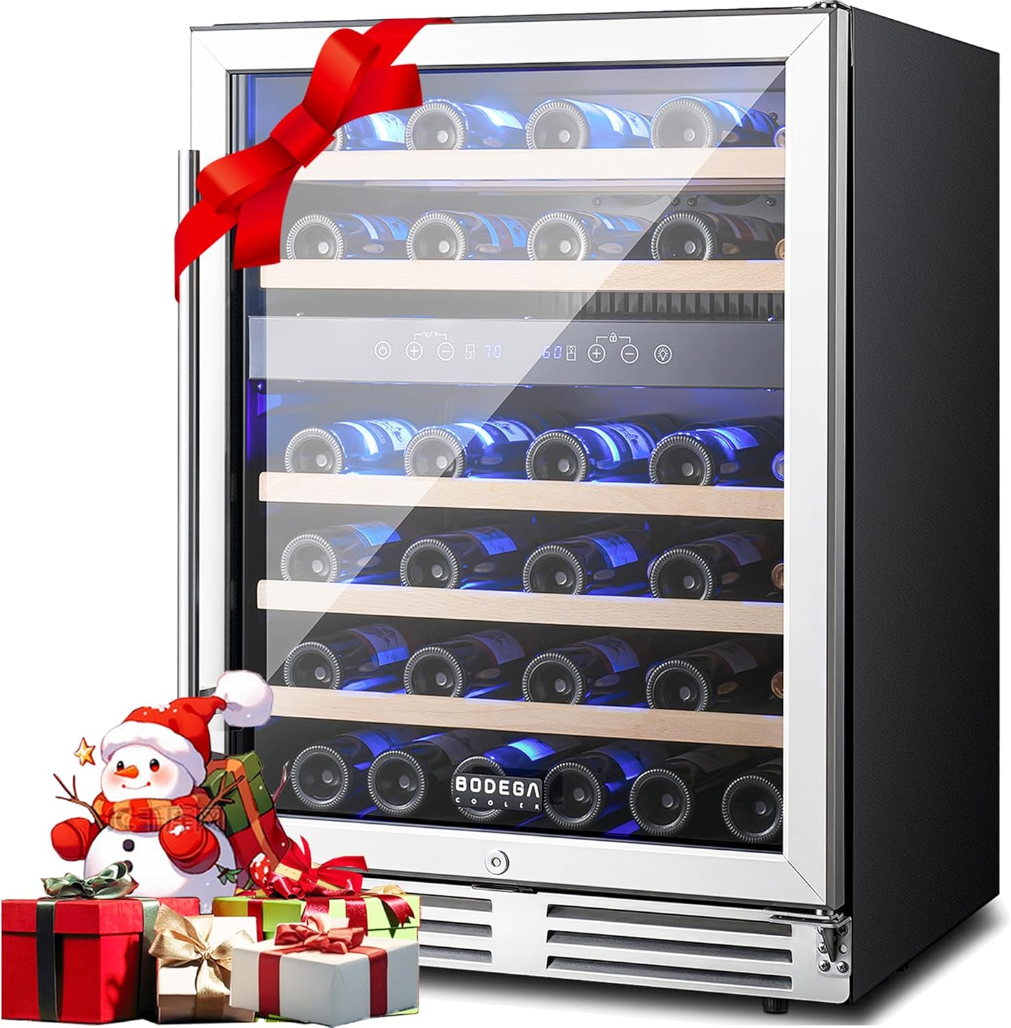 | Configuration | 1. Double tempered glass protection 2. 90W power 3. Noise as low as 42dB 4. LED screen control 5. Dual-zone dual control 6. With security lock + key, 7. Freestanding installation or built-in 8. Temperature adjustment: 5-18°C/5~18°C/40-66°F 9. Capacity: 90L 10. Holds 30 bottles of red wine 11. Number of shelves: 5 12. Size: 14.8" x 22.4" x 33.9 " 13. Temperature memory function, 14. Automatic lock function 15. Movable shelves 16. adjustable foot height (≤2inch) 17. Front air vent cooling |