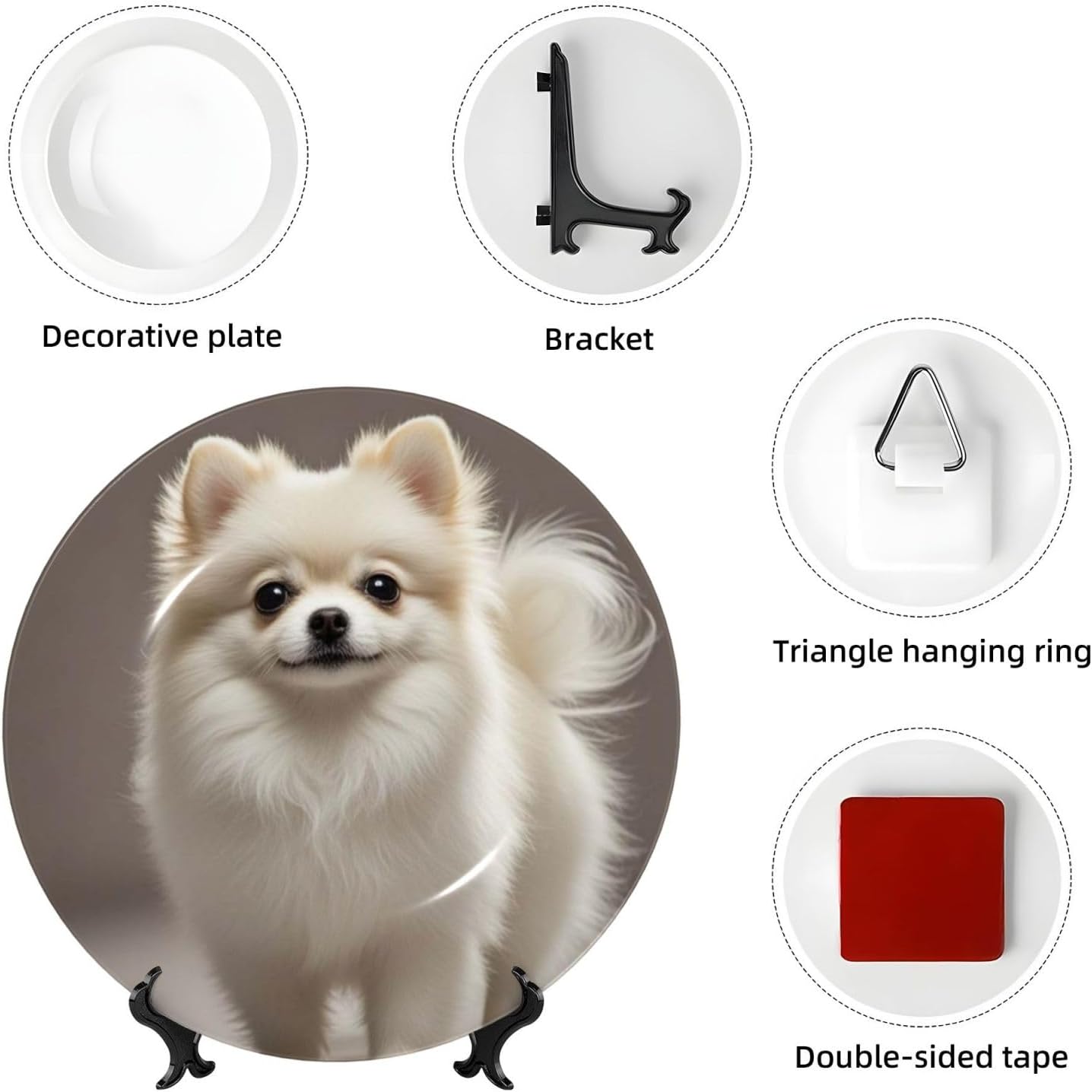 gokays decorative platedo you feel that your table is monotonous? Then use our decorative plate to add a little fun to the monotony of life.featuressize - 6 inch diameter;7 inch diameter;8 inch diameter;10 inch diametermaterial - ceramic design - Pomeranian dog package - 1 x ceramic decorative plate, 1 x stand, 1 x pothookwhy choose gokays decorative plates?advantageas manufacturers we follow current trends and bring you the latest home fashion. Salad plates ideal for placement at home or in the office. Traditional porcelain making technology, fine workmanship. Ceramic dinner plates is a good gift for family and friends.convenient to useour dinner plates rack for display has 2 ways to use, you can just place the bracket base on a flat surface first, and then put the plate on it, also you can stick the provided pothook at the back of the plate, and then stick the plate on the wall, you can choose the suitable installation method according to the actual situation.occasionour ceramic ornaments salad plates is a perfect decorative and collection for any niche, table, or mantle at your home. Perfect for your office, home, living room, dining room, playroom, kitchen, cafe, study, studio, club, bar, and others.in a surprise for your family and friends!porcelain dessert plates is a perfect gift for any person in your life. You can give it directly to your lover as mother's day gift/father's day gift/birthday gift/christmas gift/valentines day gift/anniversary gift/wedding gift/housewarming gift/new home gift.start with our funny decorative plate, refresh your rooms!