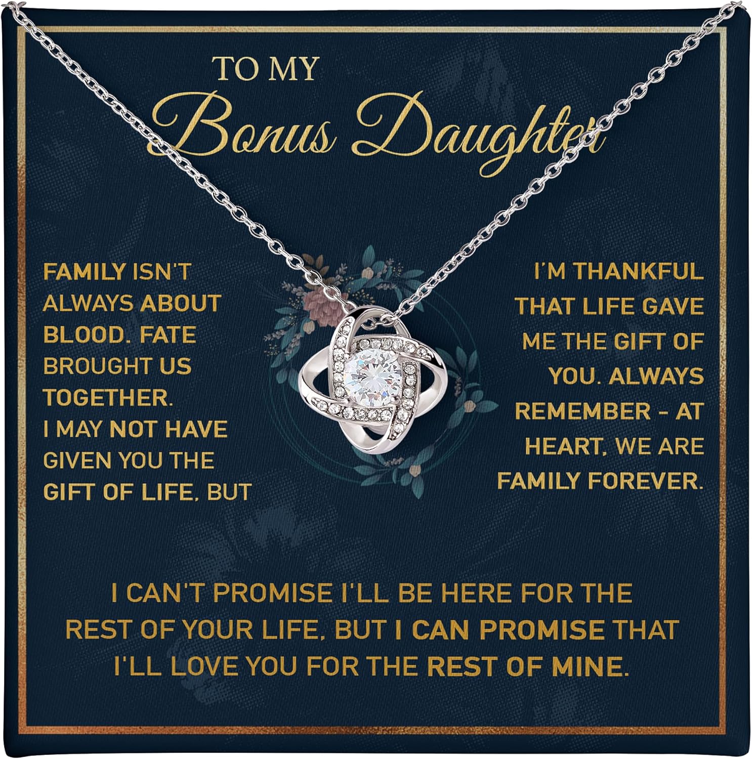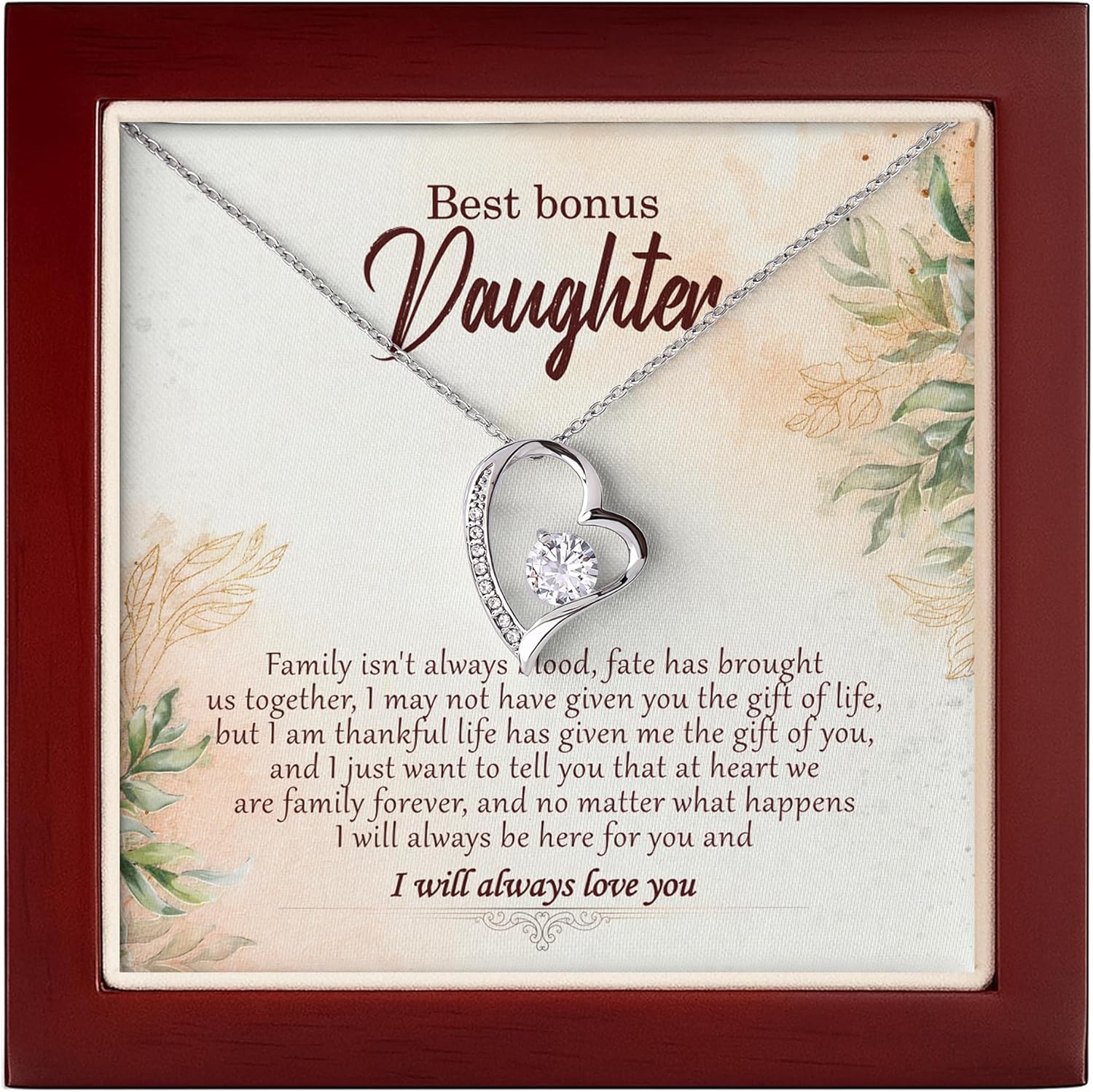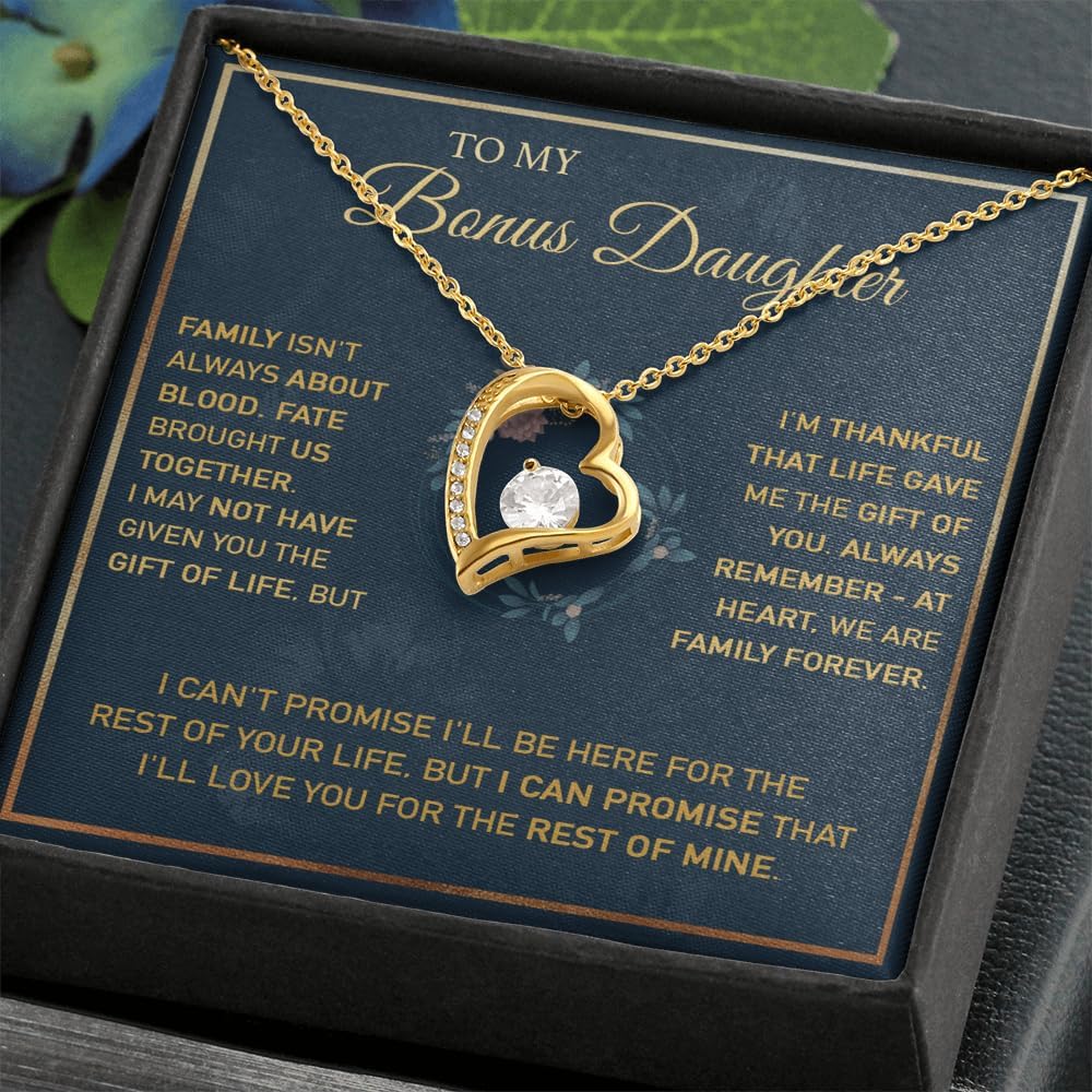 💖 TO MY BONUS DAUGHTER 💖Family isn’t always blood. Fate has brought us together. I may not have given you the gift of life, but I am thankful life has given me the gift of you. Always remember that, at heart, we are family forever. No matter what happens, I will always be here for you, and I will always love you. I can’t promise I’ll be here for the rest of your life, but I can promise that I’ll love you for the rest of mine.🎁 Meaningful Gift for Her: A touching keepsake for your bonus daughter or daughter-in-law, expressing love that goes beyond blood. Ideal for birthdays, weddings, or holidays.✨ Premium Craftsmanship: Made with 14K white gold over stainless steel, featuring a dazzling cubic zirconia stone in our signature Love Knot design — representing unbreakable bonds.💝 Gift-Ready Presentation: Arrives with a heartfelt message card in an elegant jewelry box. Perfect for gifting from mom, dad, or in-laws — show her she’s truly family by heart.