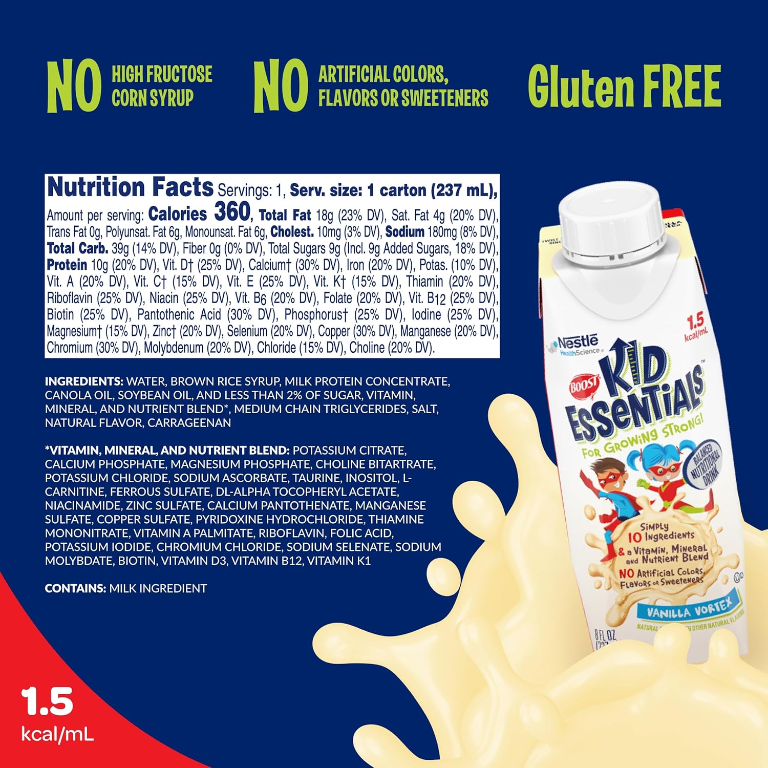 Boost kid Essentials 1.5 nutritionally complete drink is a nutritionally complete pediatric drink delivers more calories in less volume than a standard 1.0 calorie drink. Available in Chocolate craze & Vanilla Vortex flavors.
