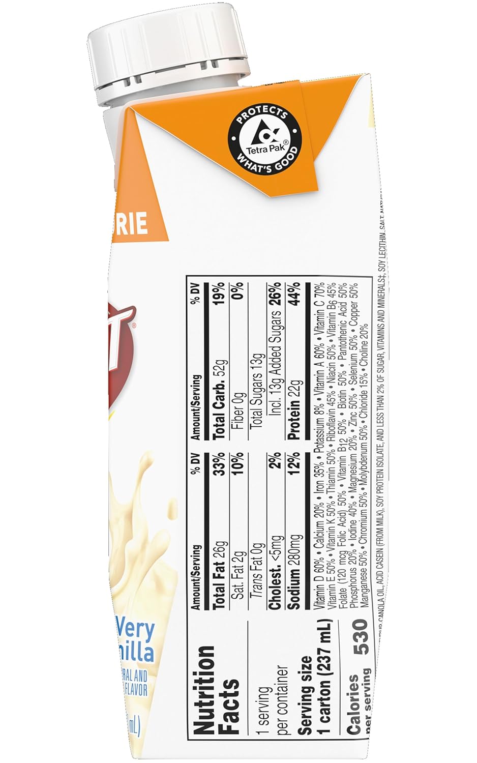 Boost VHC - Very high calorie complete nutritional drink that provides 530 calories per 8 fl oz serving, 22 grams of protein, and 26 vitamins and minerals. The most calorically dense nutritionally complete oral beverage - 2.25 kcal/ml. Combines high calories with high protein to help preserve lean muscle mass and support weight goals. Best if served chilled. We recommend BOOST VHC drinks are chilled over ice for those that prefer a less thick drink.