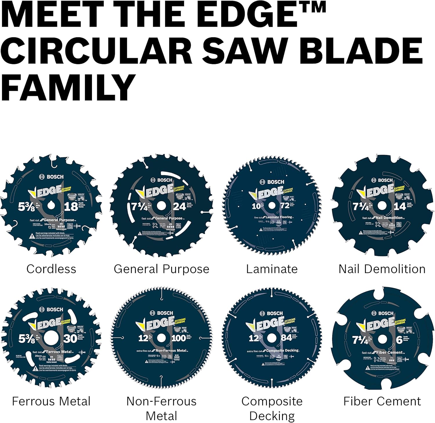 Bosch Edge Circular Saw Blades for composite decking are designed with a triple chip grind tooth geometry that results in clean cuts in abrasive material – like composite decking. The blades are made with Brute™ Carbide, an upgraded C3/C4 micrograin carbide formulation that increases impact resistance for long life. Thin kerf design provides fast cuts and less waste in decking materials. SpeedCoat finish means less friction for fast effortless cuts. The full line of Edge composite decking blades can be used across different saws.