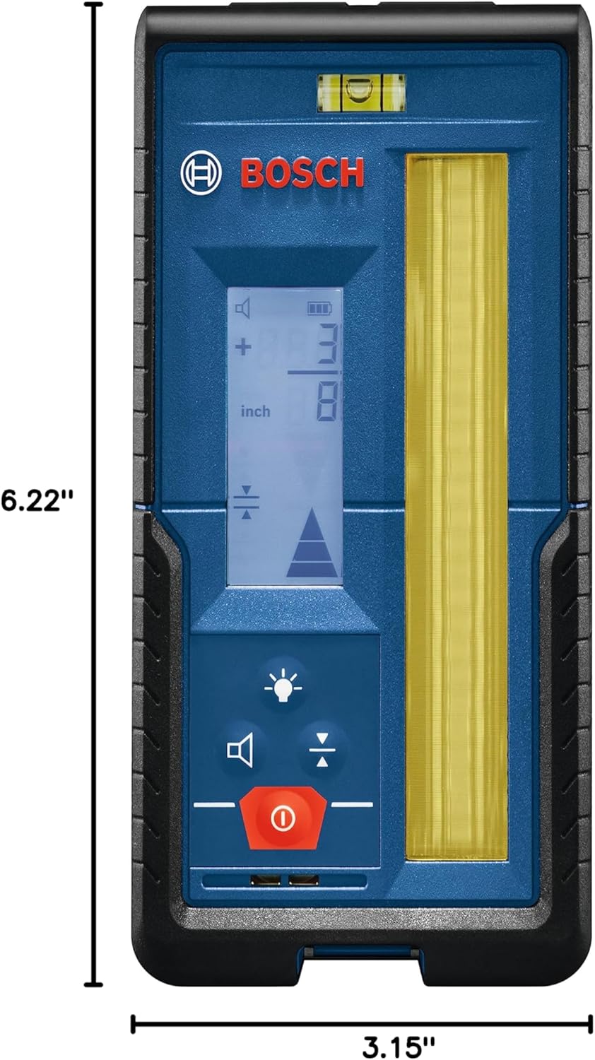 The Bosch LR20 Rotary Laser Receiver is designed to increase the GRL2000-40H and GRL2000-40HV rotary laser detection up to 1,000 feet, with a backlit LCD display for use in darker areas or outdoors. The display illuminated large, easy-to-see indicators, including up/down arrows, center line, accuracy level, battery level and audio signal. It also has dual-sided indicators, to provide easy visual readout on both sides of the receiver. The oversized laser detection area helps find the laser beam faster, making it easier to start setting level. The receiver provides convenience features such as built-in magnets for secure attachment to metal surfaces, an adjustable audio indicator, intuitive four-button keypad, receiver vial and ergonomic soft grip.