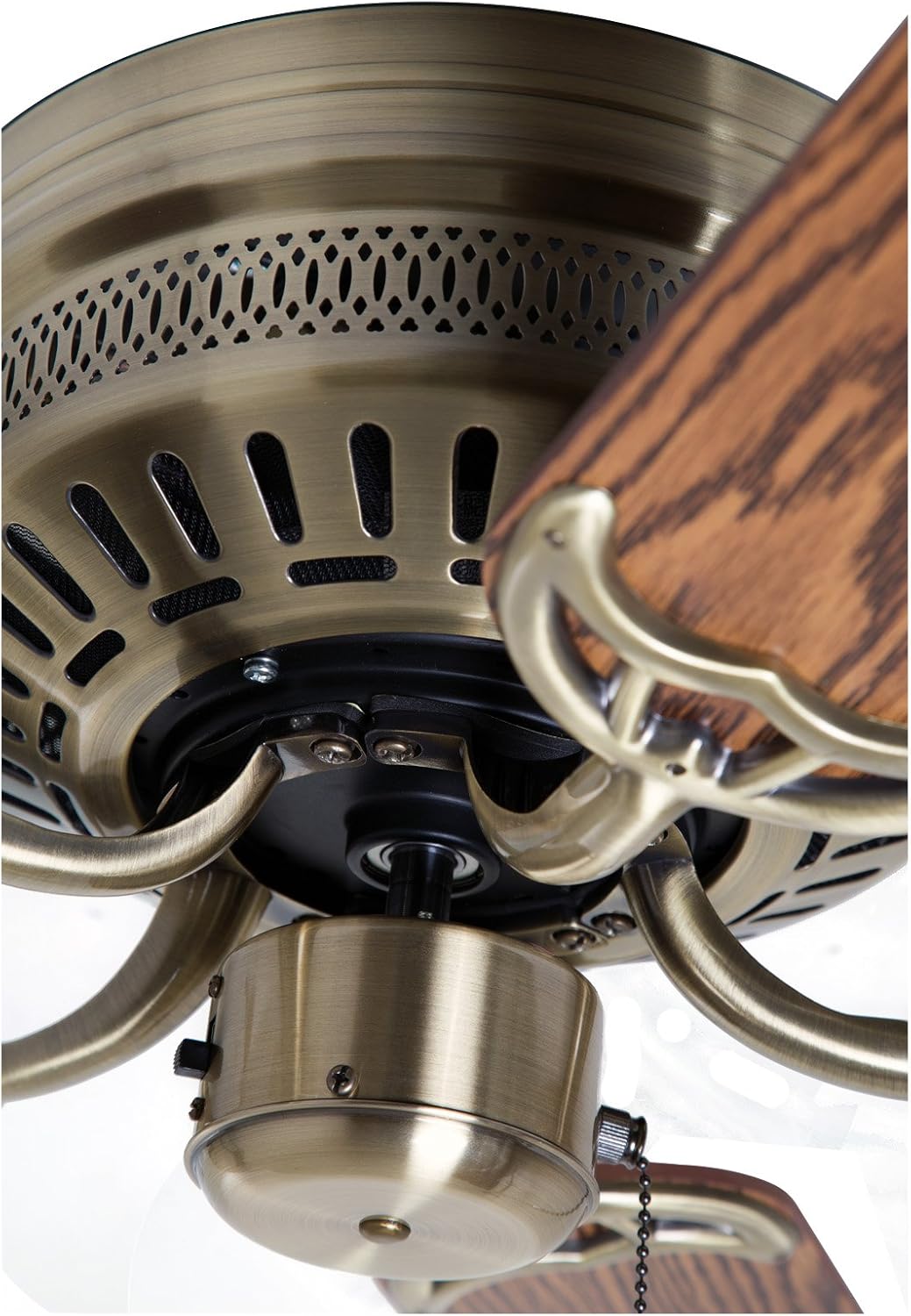 Boston Harbor Ceiling Fan, Hugger, Low Profile, Model: CF-78049L, 52 in Blade, 3 Speeds, 5 Blades, Medium Density Fiberboard Blade, Antique Brass, Includes: Safety Cable, (3) 13 W E27 Base CFL Bulb Light Kit, UL Listed. Hugger style, mounts directly to the ceiling, no down rod required. Reversible 3-speed pull chain controlled 153 x 13 mm single capacitor motor for up or down flow. 5 MDF reversible blades. Alabaster Dome light kit uses two 60 watt maximum E12 base bulbs,.