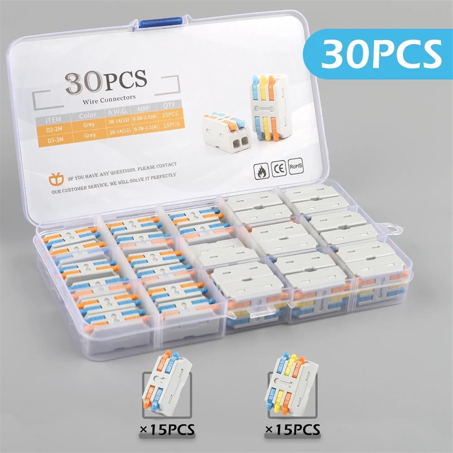 Wire TerminalsProduct Details:Boxed Mini Compact Wire Wiring Connector Conductor 2/3Pin With Lever Push-in Butt Terminal Block Electric Connection AWG28-12Model Number:D2-2/D3-3Voltage: 220VCertification: Certification: Current: 32ACable Range: 0.08-2.5(4.0)mm²AWG: 28-14(12)